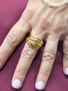 Anello regolabile in metallo dorato dal design intrecciato, ispirato al simbolo del Filo della Vita: un intreccio continuo che rappresenta forza, equilibrio e connessione.