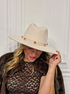 Cappello in feltro con falda rigida e cinturino decorato da borchie dorate. Design strutturato, perfetto per aggiungere carattere a ogni look autunnale o invernale.