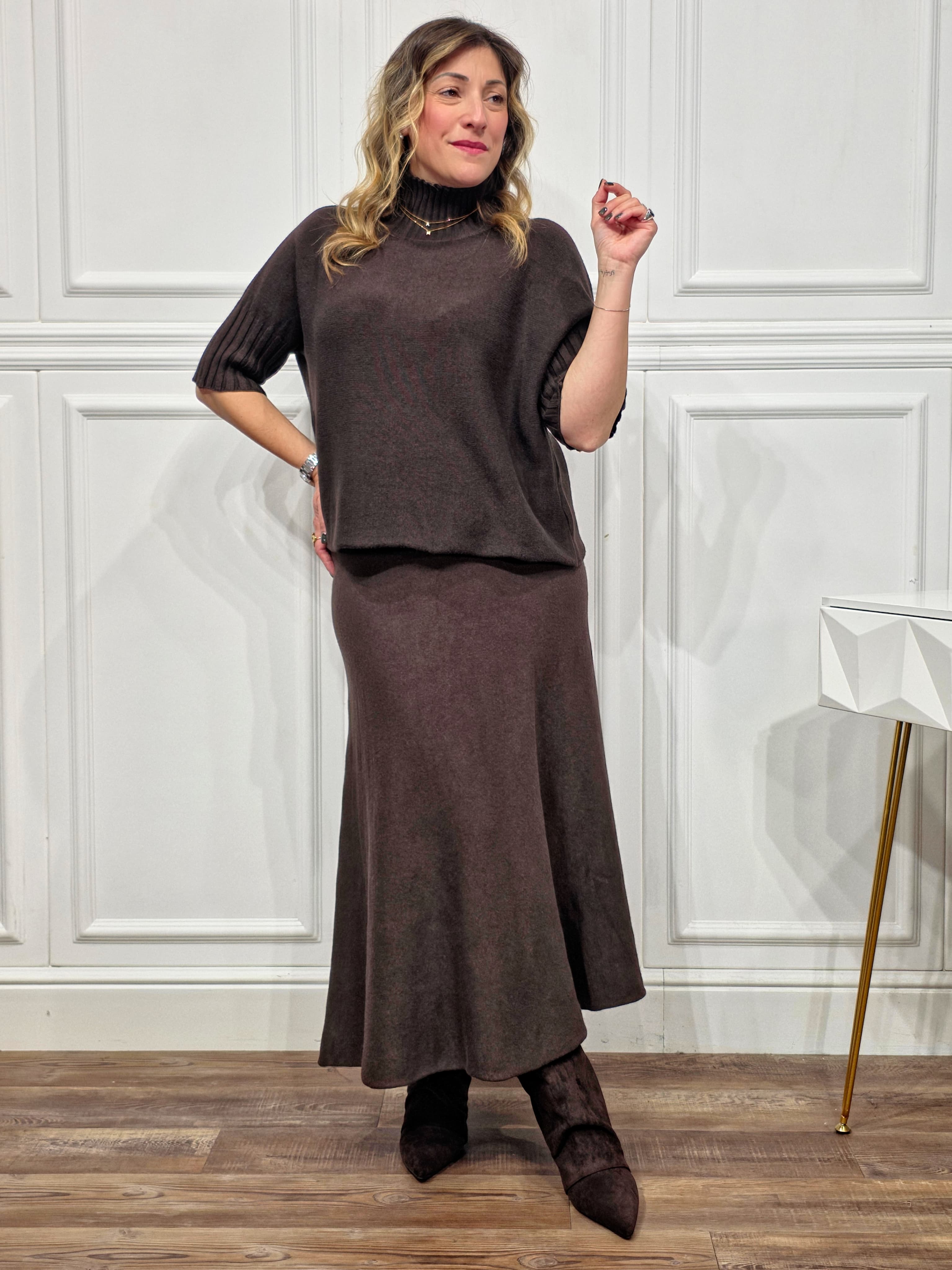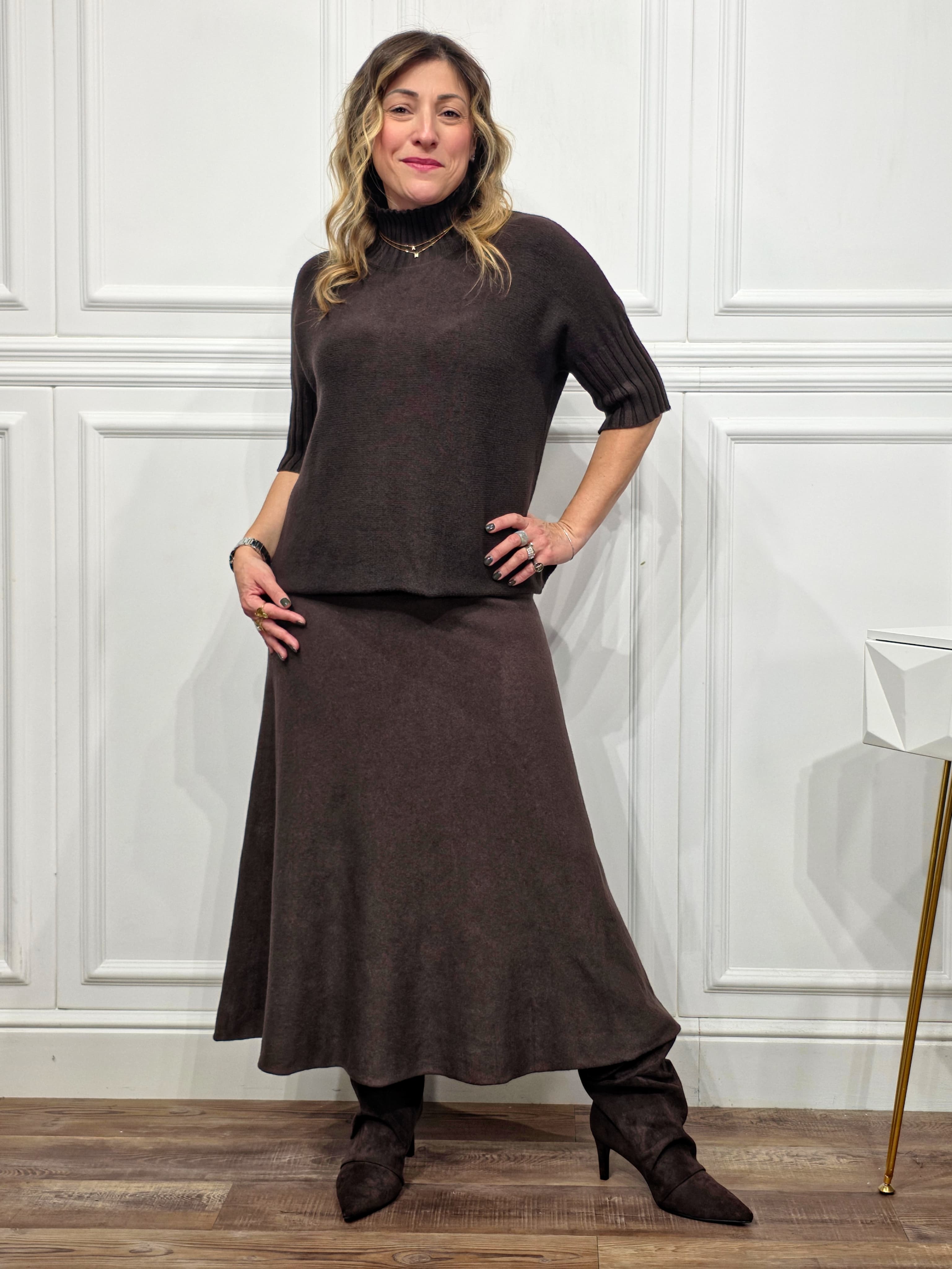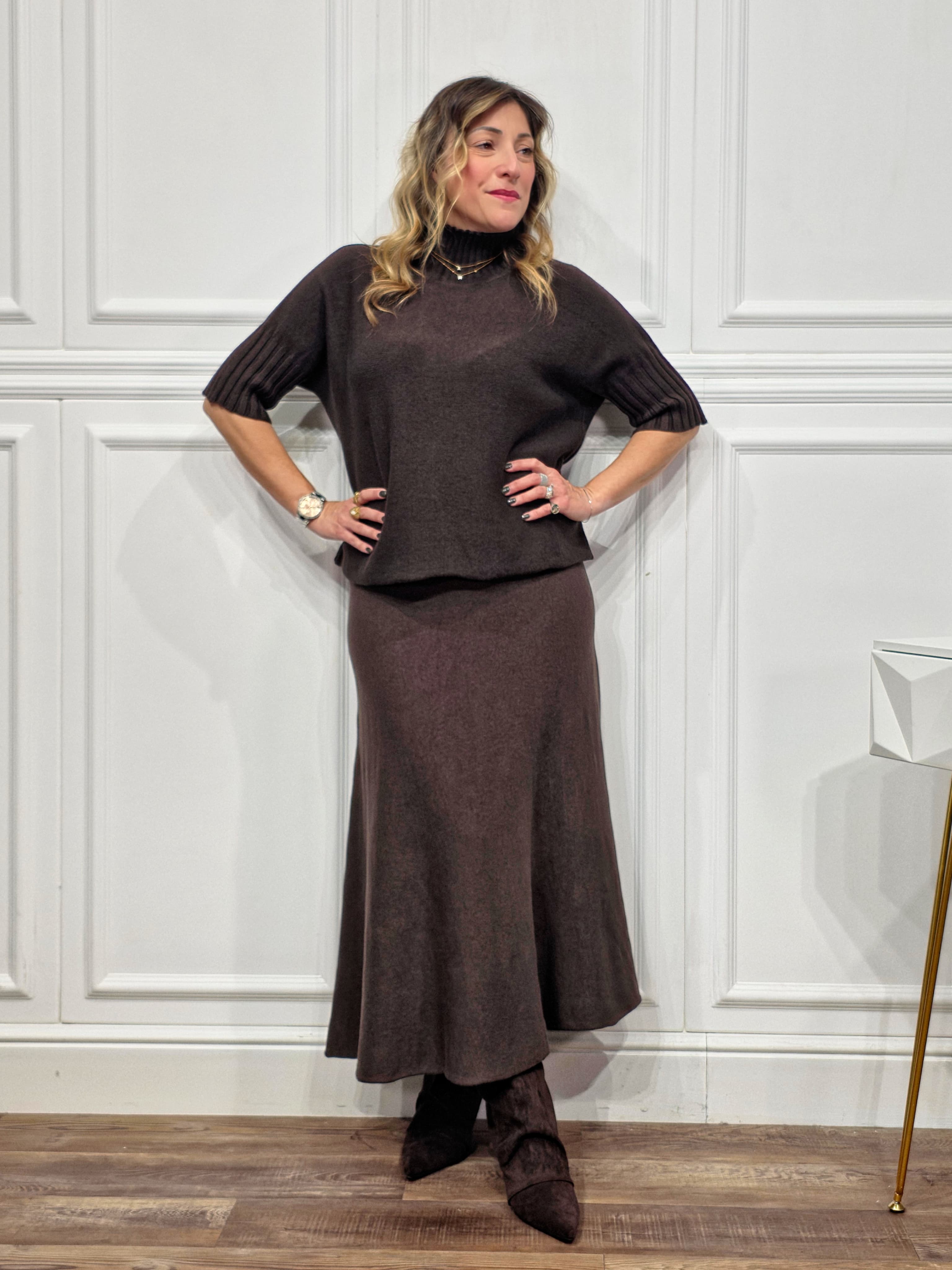 Una gonna morbida, femminile e confortevole, perfetta da indossare con il pull coordinato o con maglie e camicie più strutturate. Il modello è caratterizzato da una linea svasata che scende fluida, valorizzando la silhouette senza segnare. Il tessuto in maglia garantisce comfort, calore e una vestibilità impeccabile per tutto il giorno.
