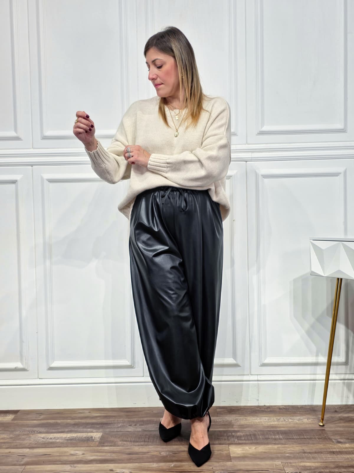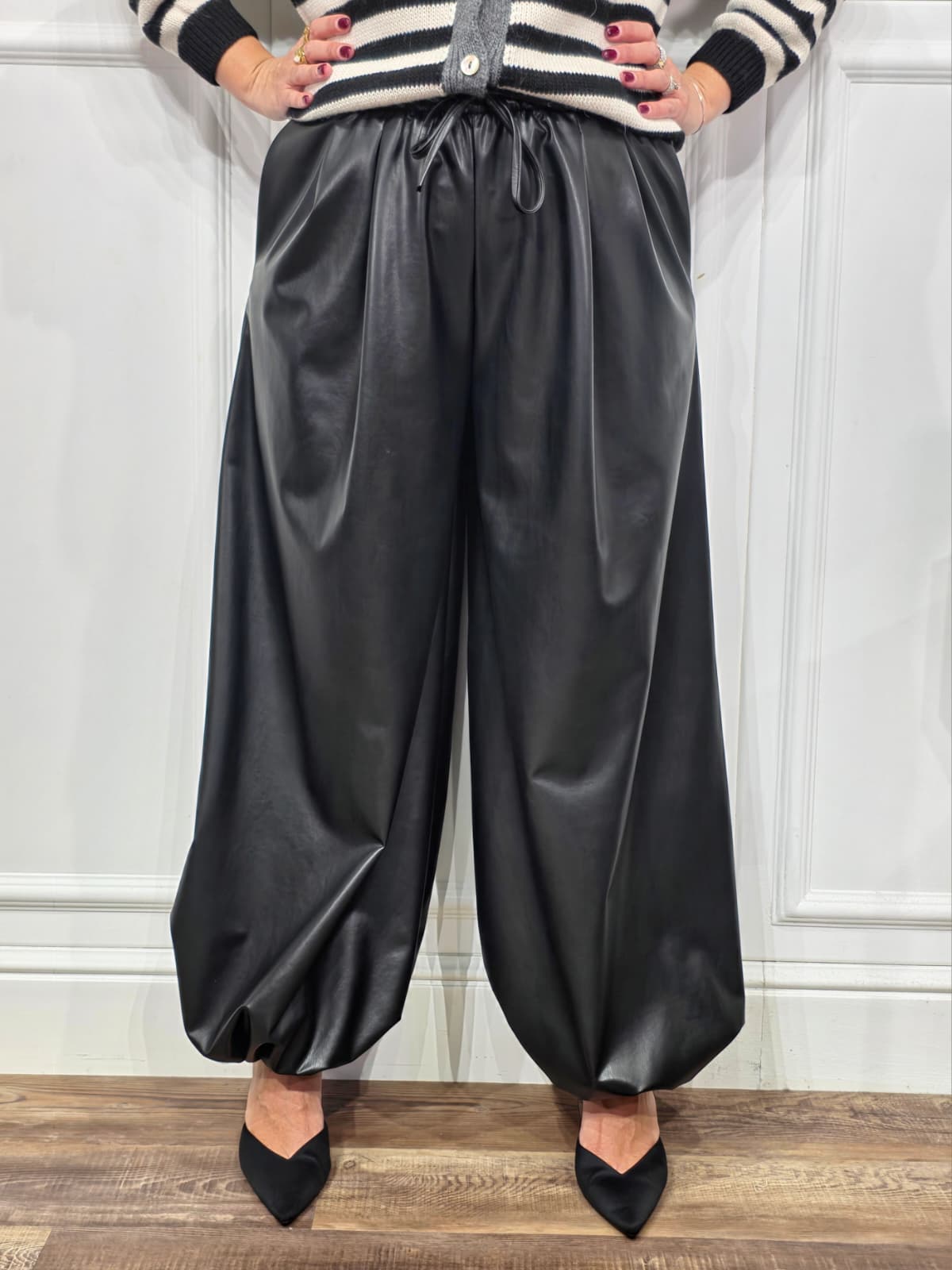 Pantalone ballon con elastico alla caviglia, tasche a filo e coulisse regolabile in vita. La linea ampia dona comfort e carattere, con un effetto contemporaneo e deciso.
