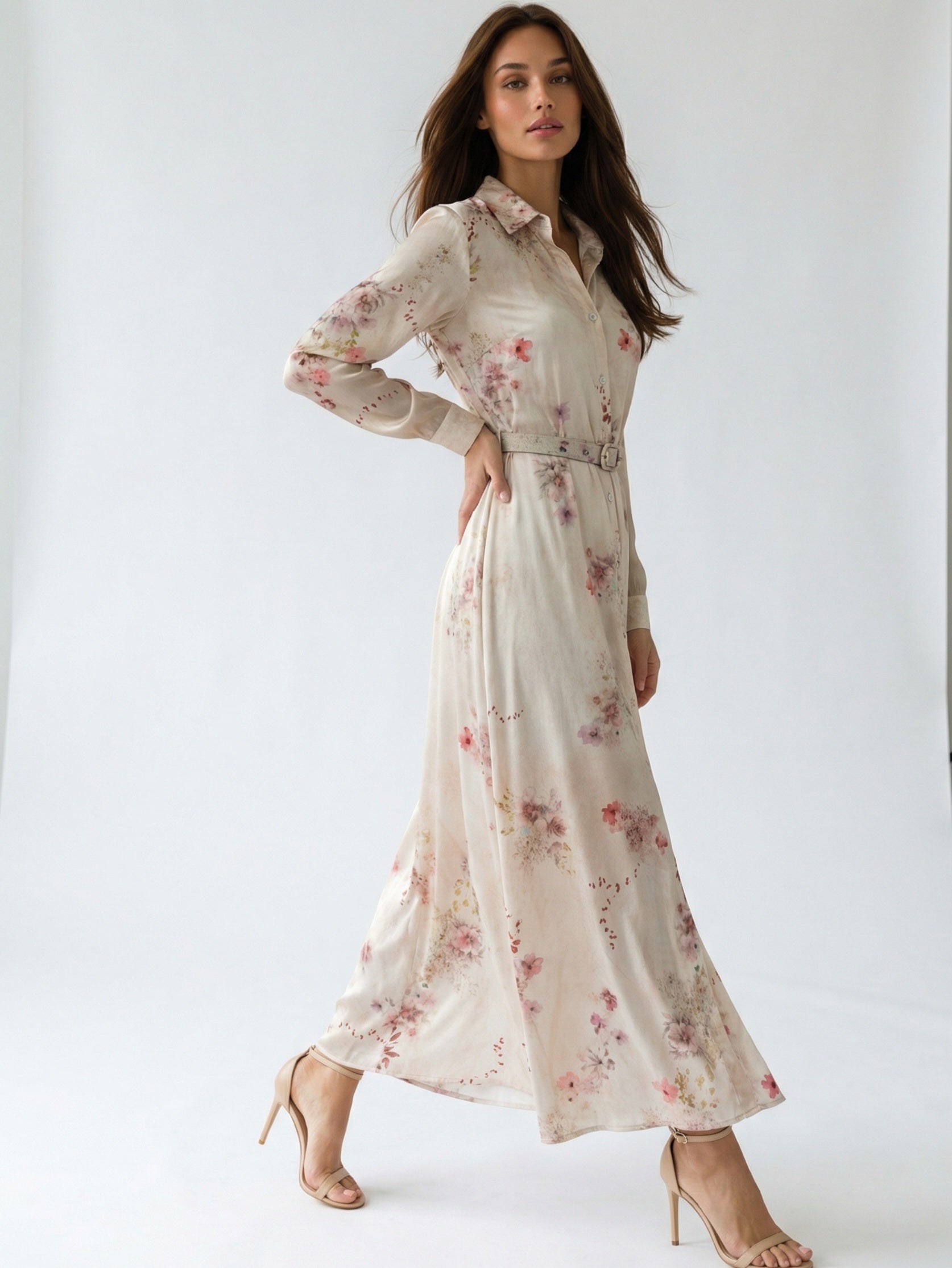 Chemisier Aurora lungo fantasia floreale con cintura – Beige
