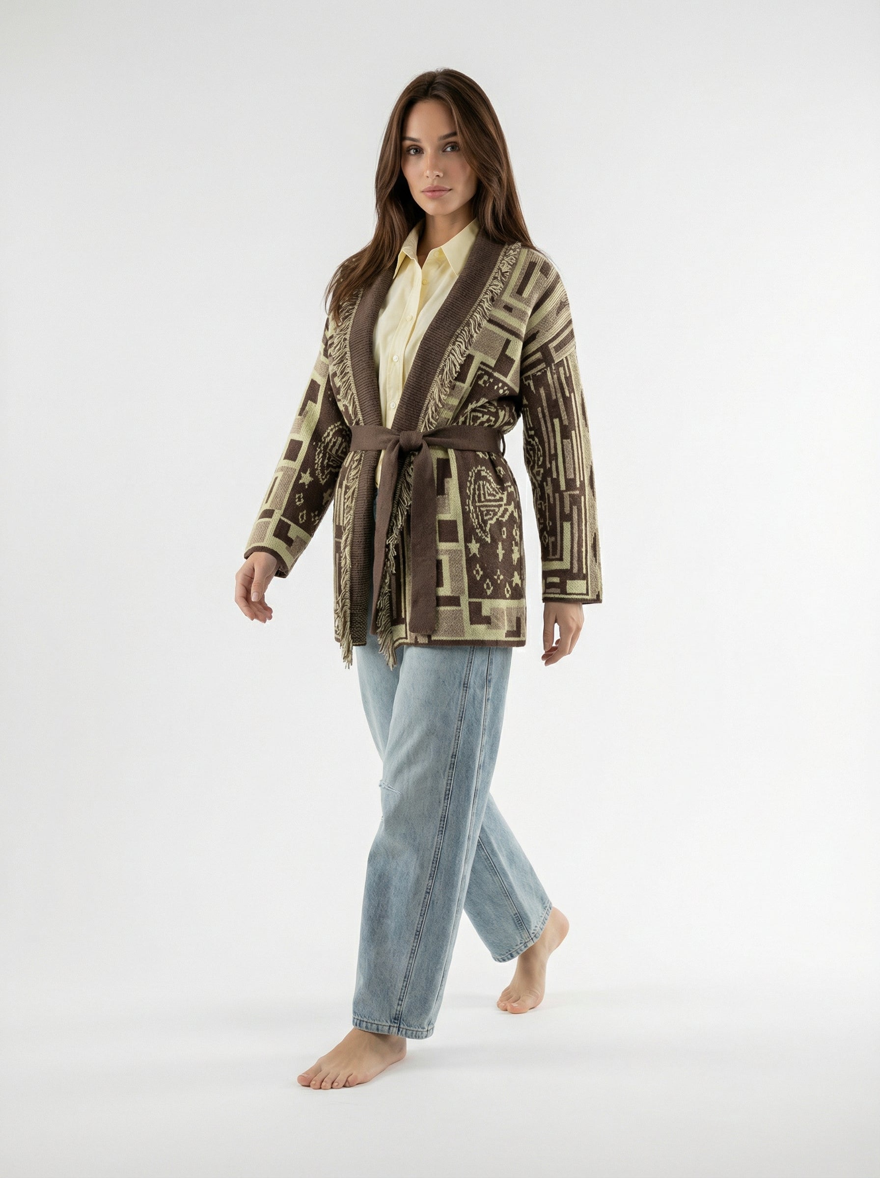 Cardigan Maya lungo con cintura – Marrone e beige