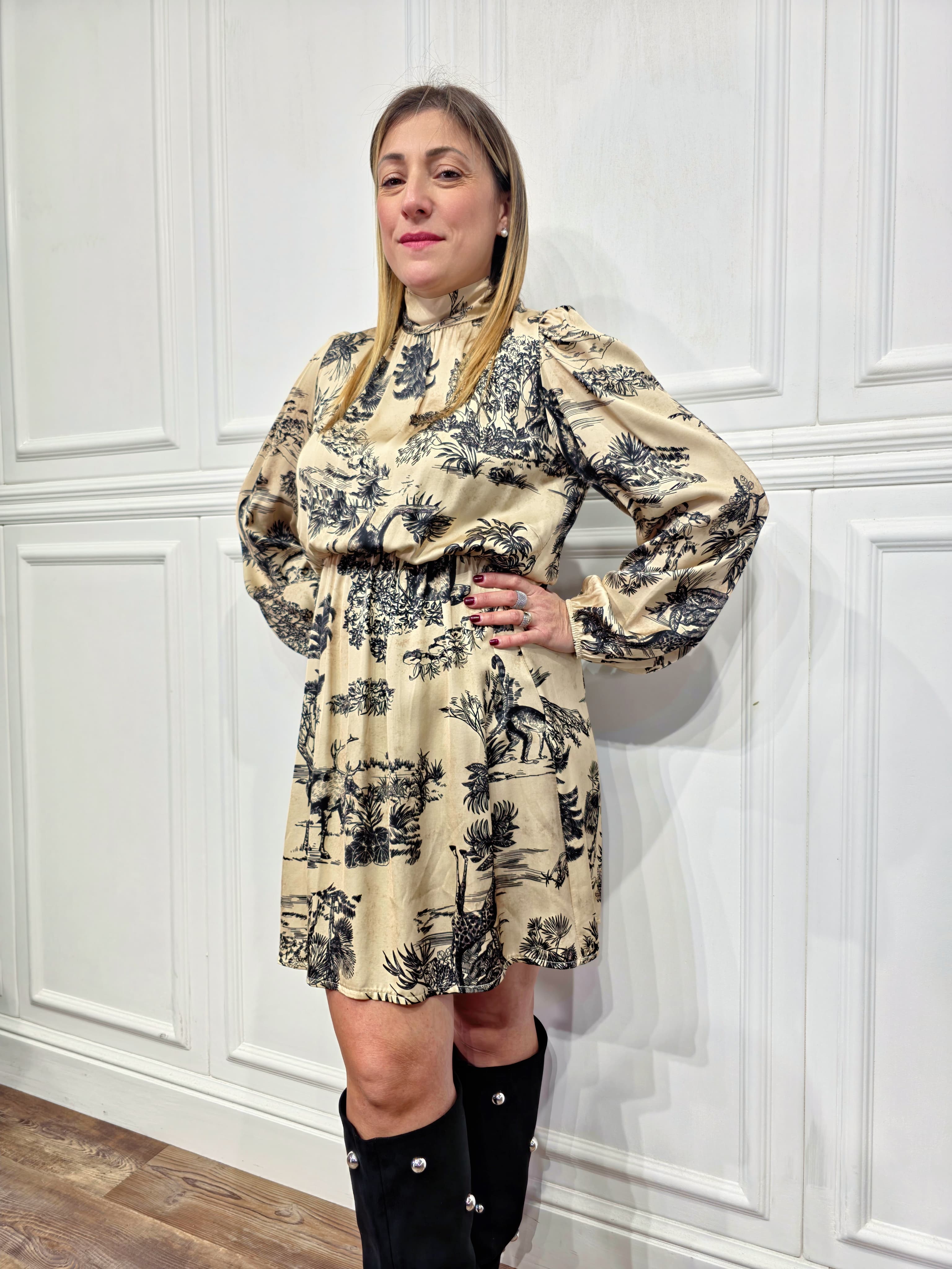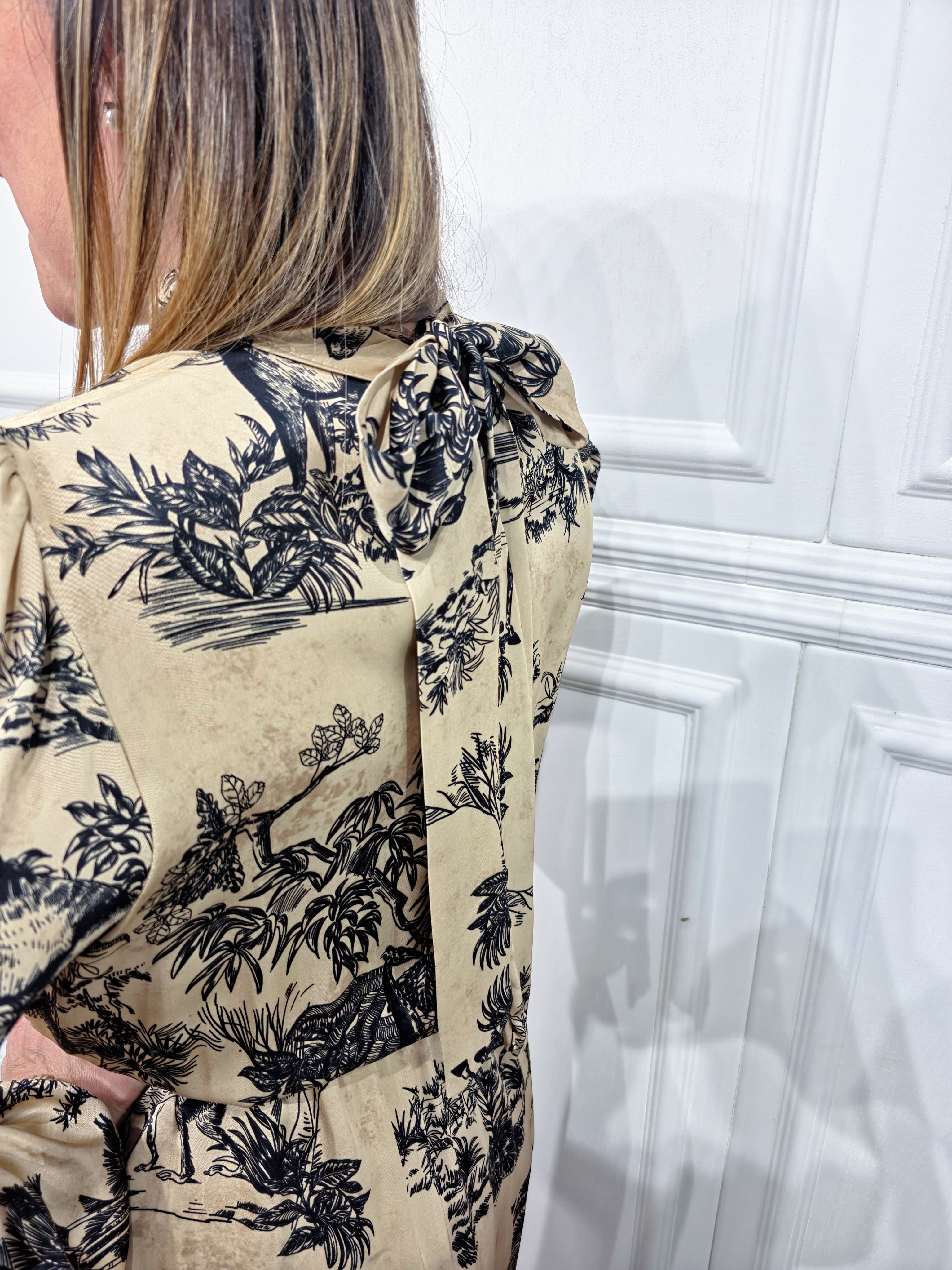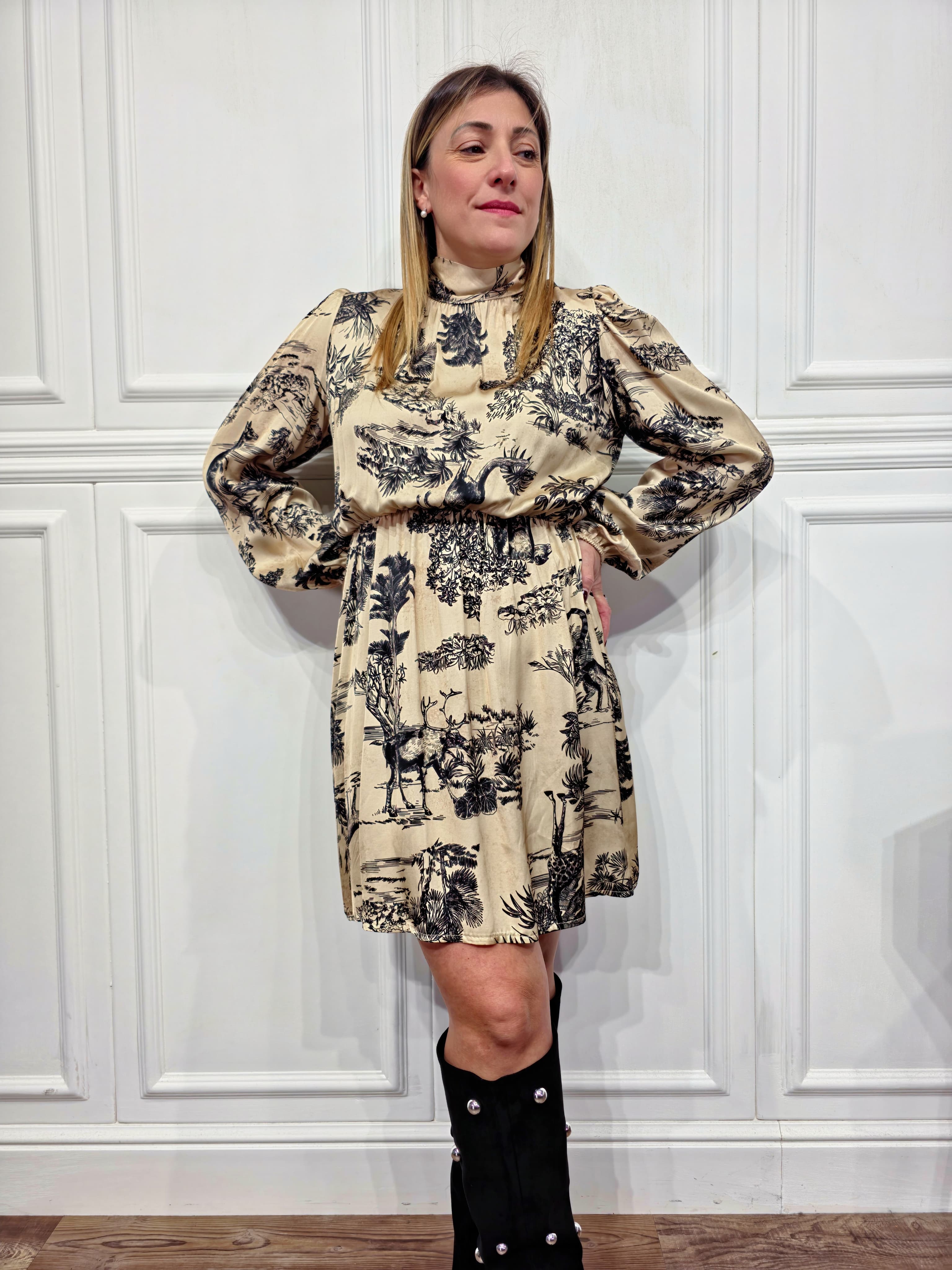 Un modello elegante e romantico, ideale per ogni occasione. L’abito presenta un mezzo collo con chiusura a fiocco sul retro, maniche lunghe leggermente balloon e un elastico in vita che valorizza la silhouette. Il tessuto leggero e la stampa toile de jouy lo rendono raffinato e di grande tendenza.
