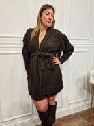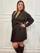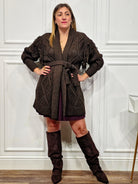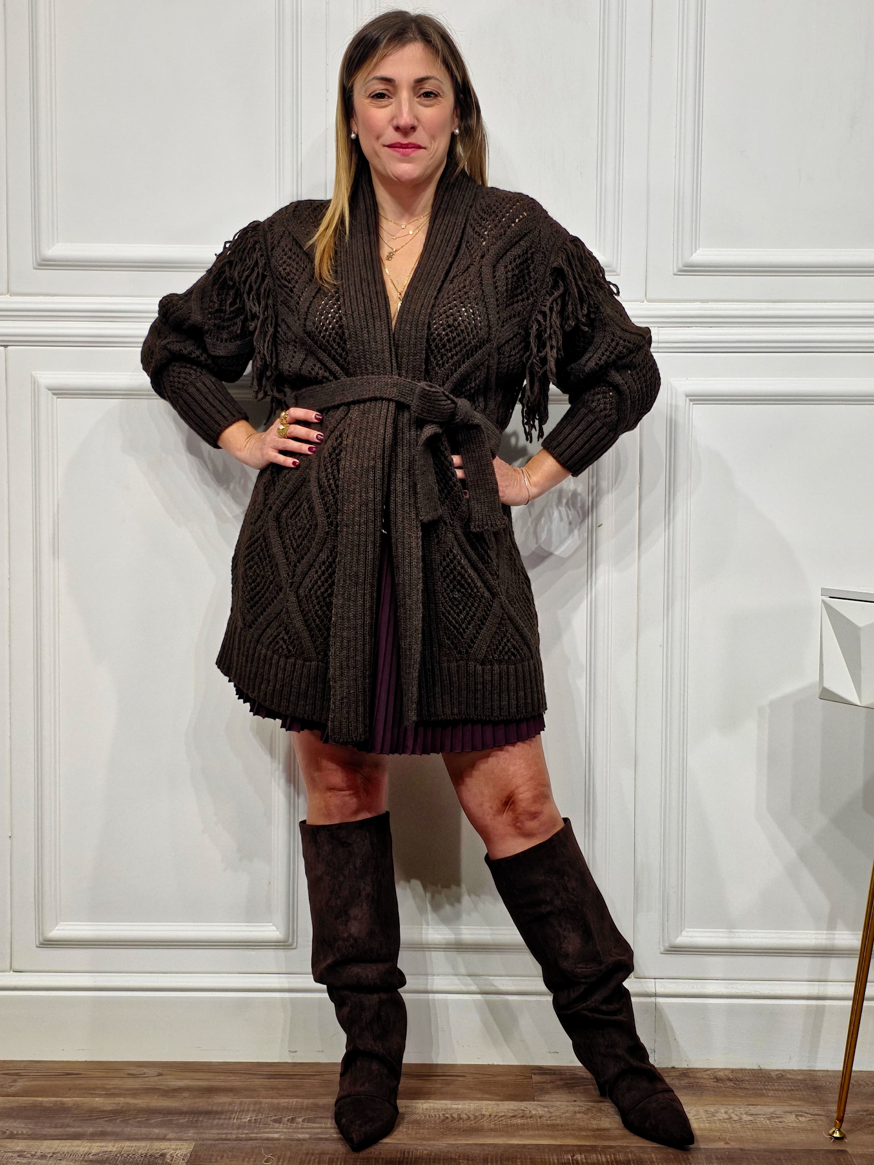 Un modello caldo e avvolgente che unisce stile e comfort. Il cardigan è caratterizzato da un lavoro traforato che dona leggerezza al tessuto, maniche arricchite da frange tono su tono per un tocco di originalità e una cintura in vita che permette di regolare la vestibilità e valorizzare la silhouette.