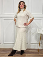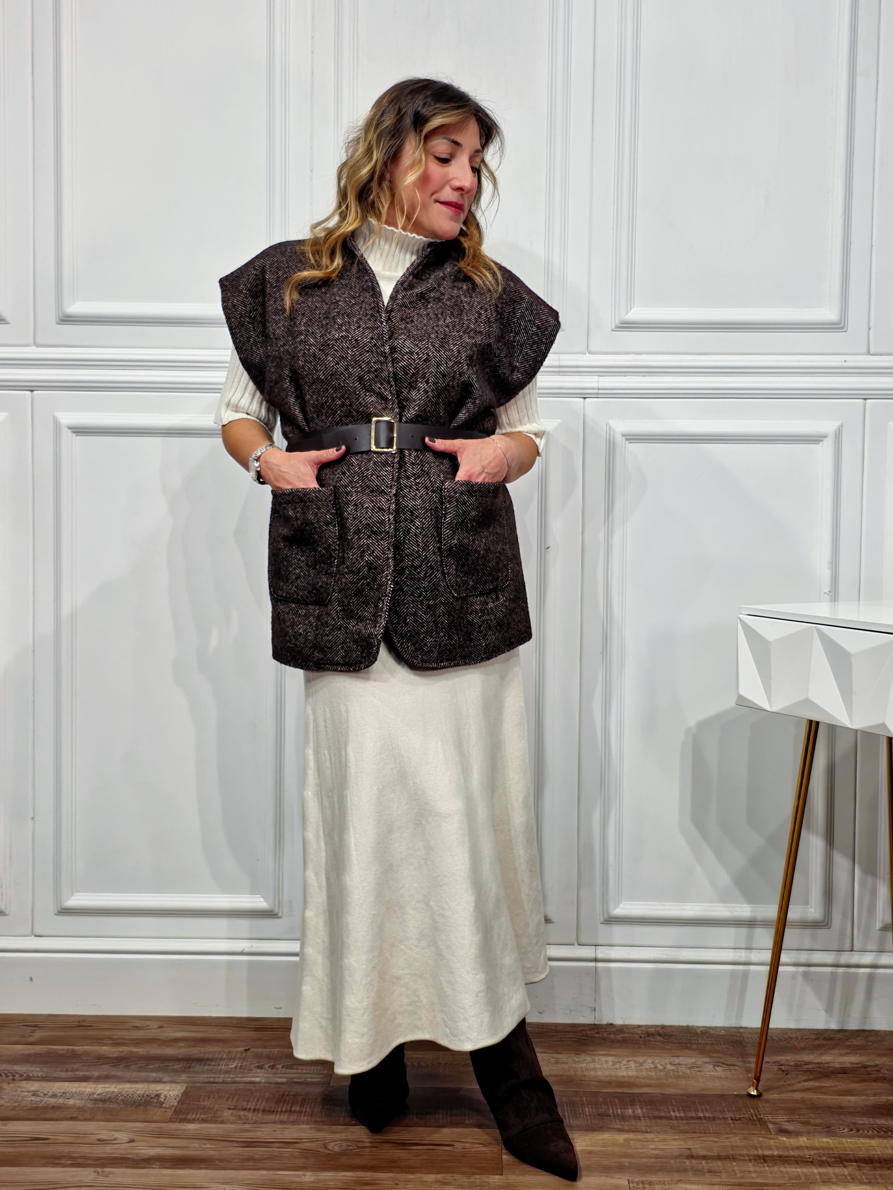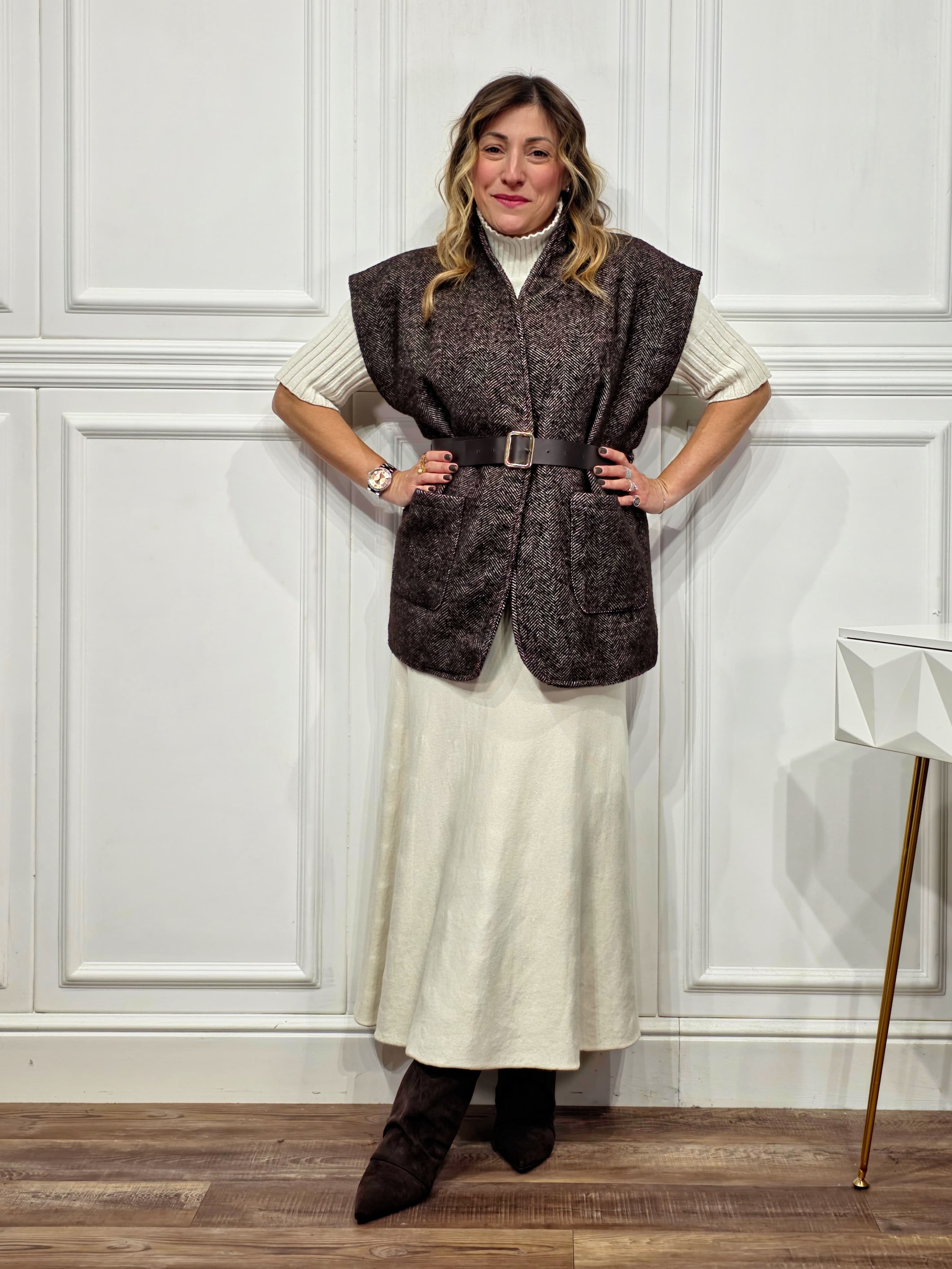 Una gonna morbida, femminile e confortevole, perfetta da indossare con il pull coordinato o con maglie e camicie più strutturate. Il modello è caratterizzato da una linea svasata che scende fluida, valorizzando la silhouette senza segnare. Il tessuto in maglia garantisce comfort, calore e una vestibilità impeccabile per tutto il giorno.