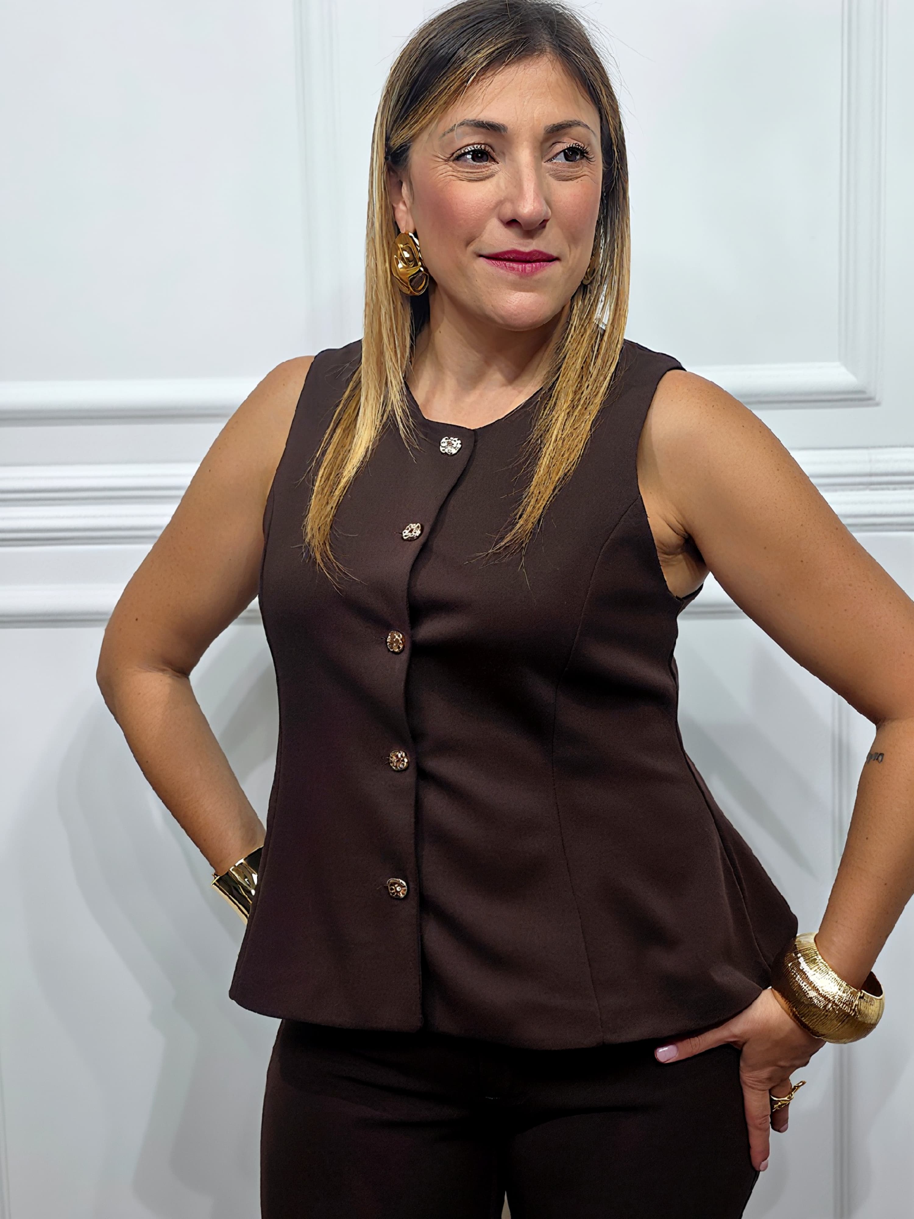 Gilet smanicato in viscosa dalla linea leggermente svasata, chiusura frontale con bottoni rivestiti tono su tono e scollo tondo. Un capo versatile e raffinato, ideale sia da solo che abbinato al pantalone coordinato per un total look elegante ma moderno.