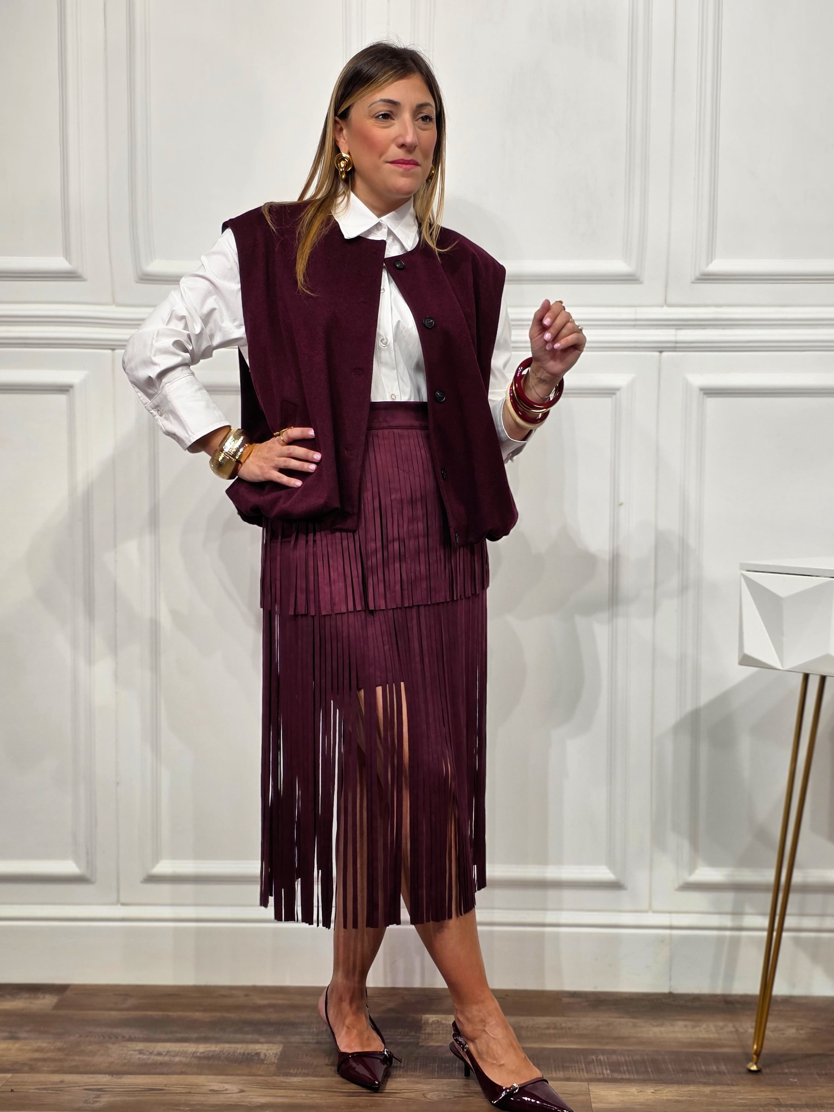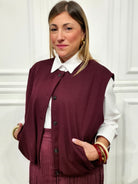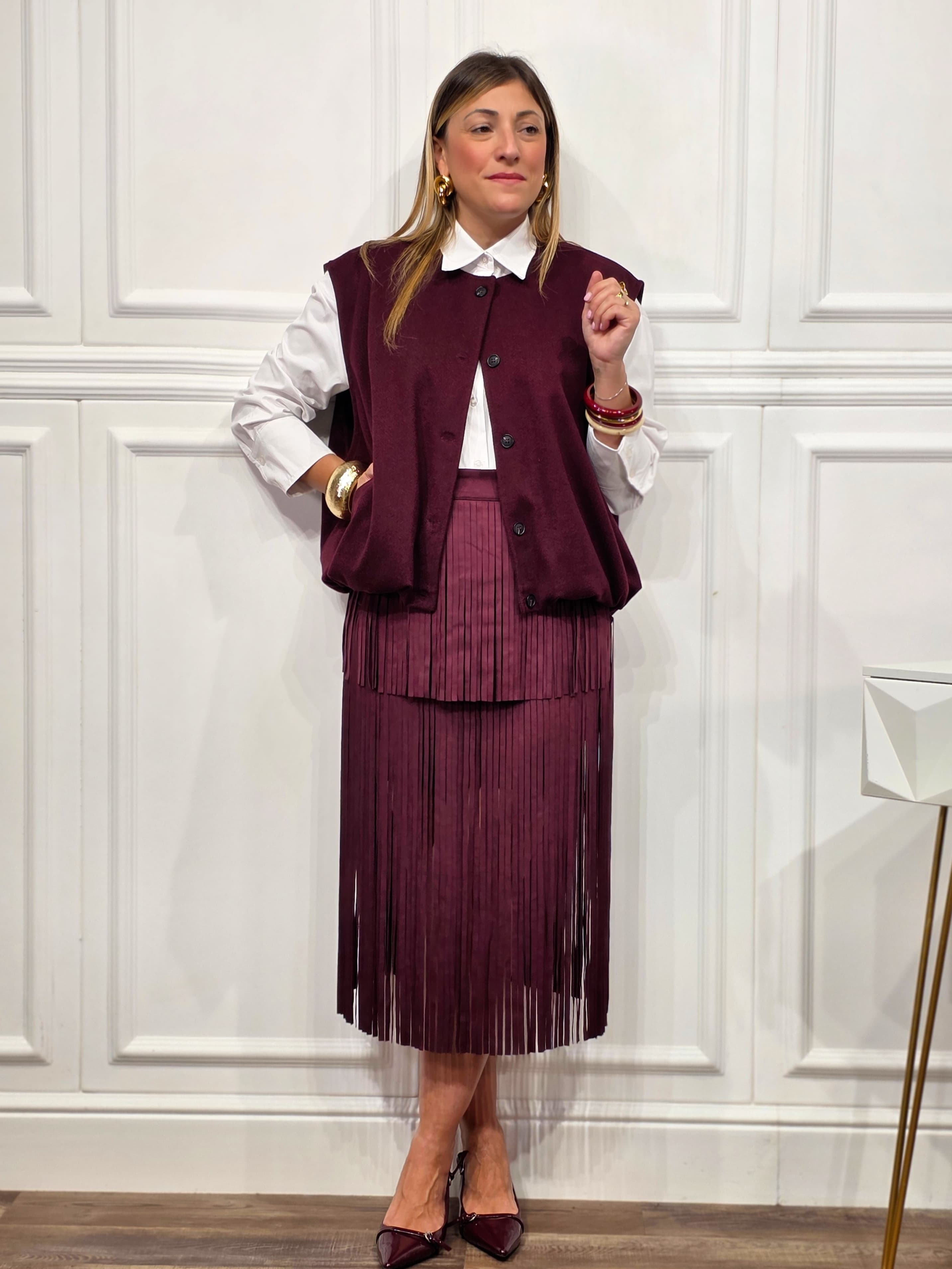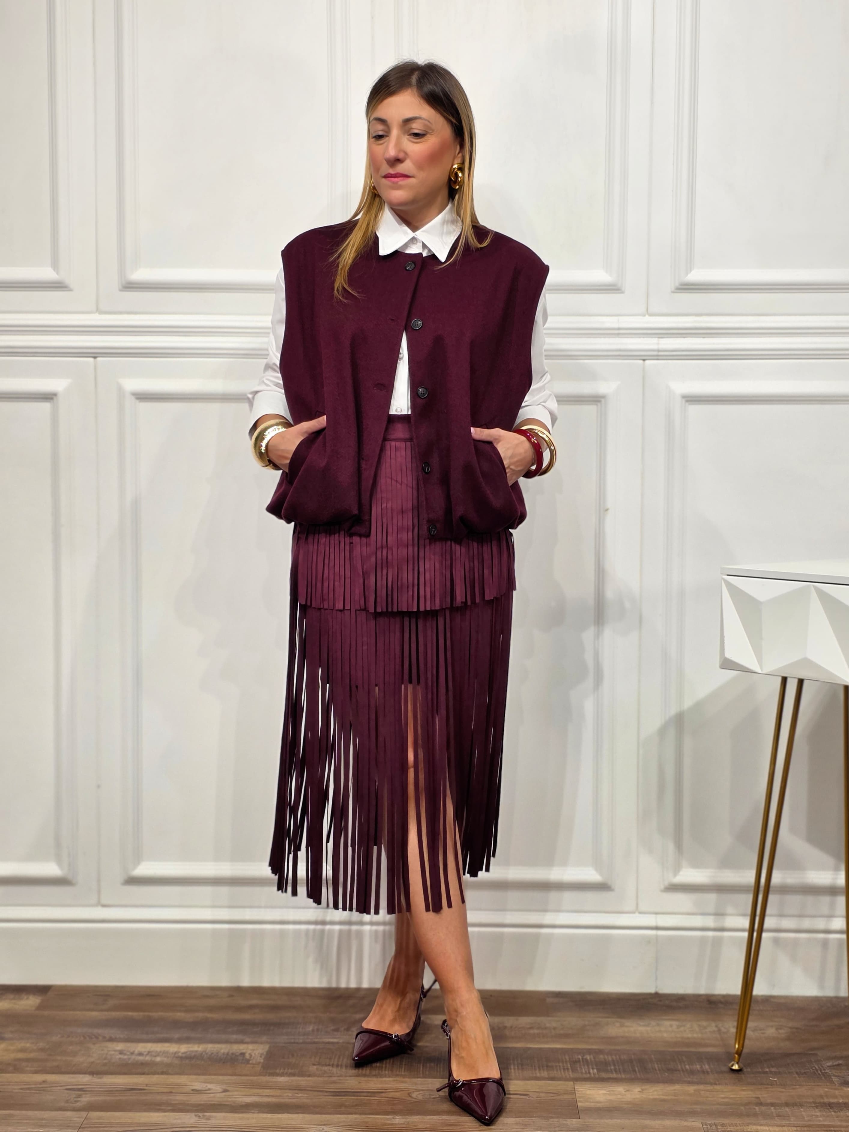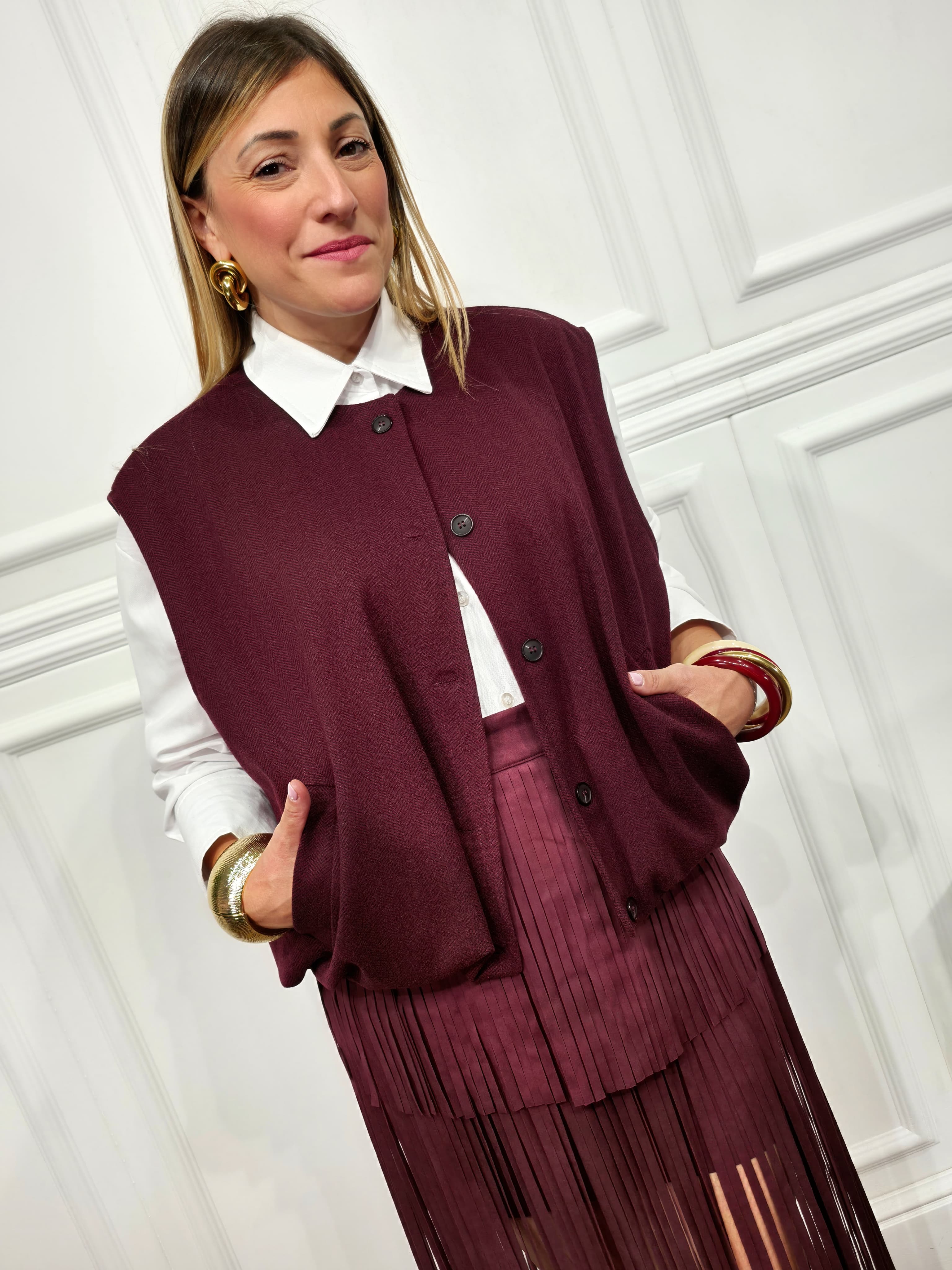 Gilet in maglia morbida color vinaccia, con scollo paricollo e linea dritta oversize. Chiusura con bottoni frontali e spalle leggermente scese per un fit rilassato ma elegante.