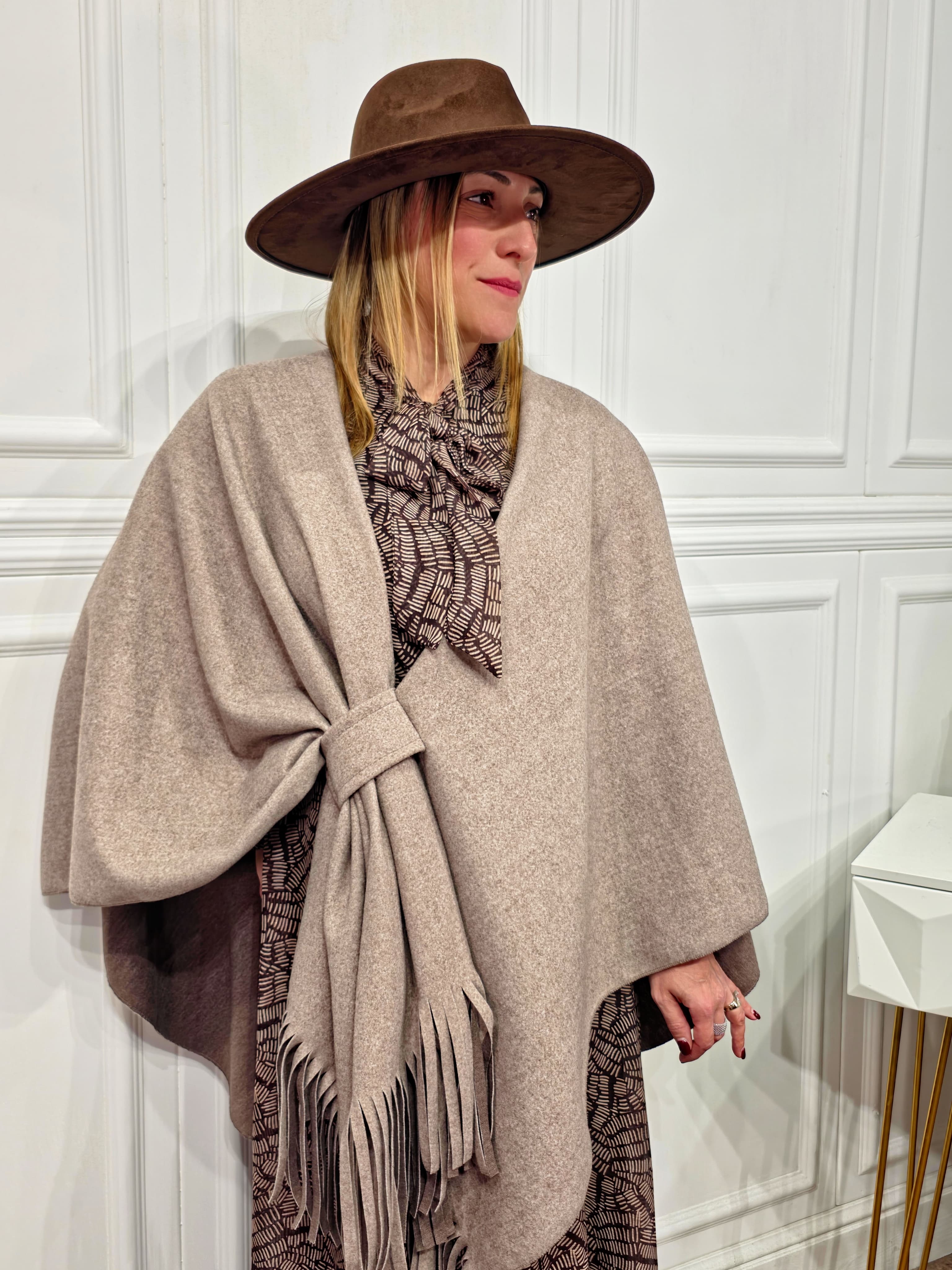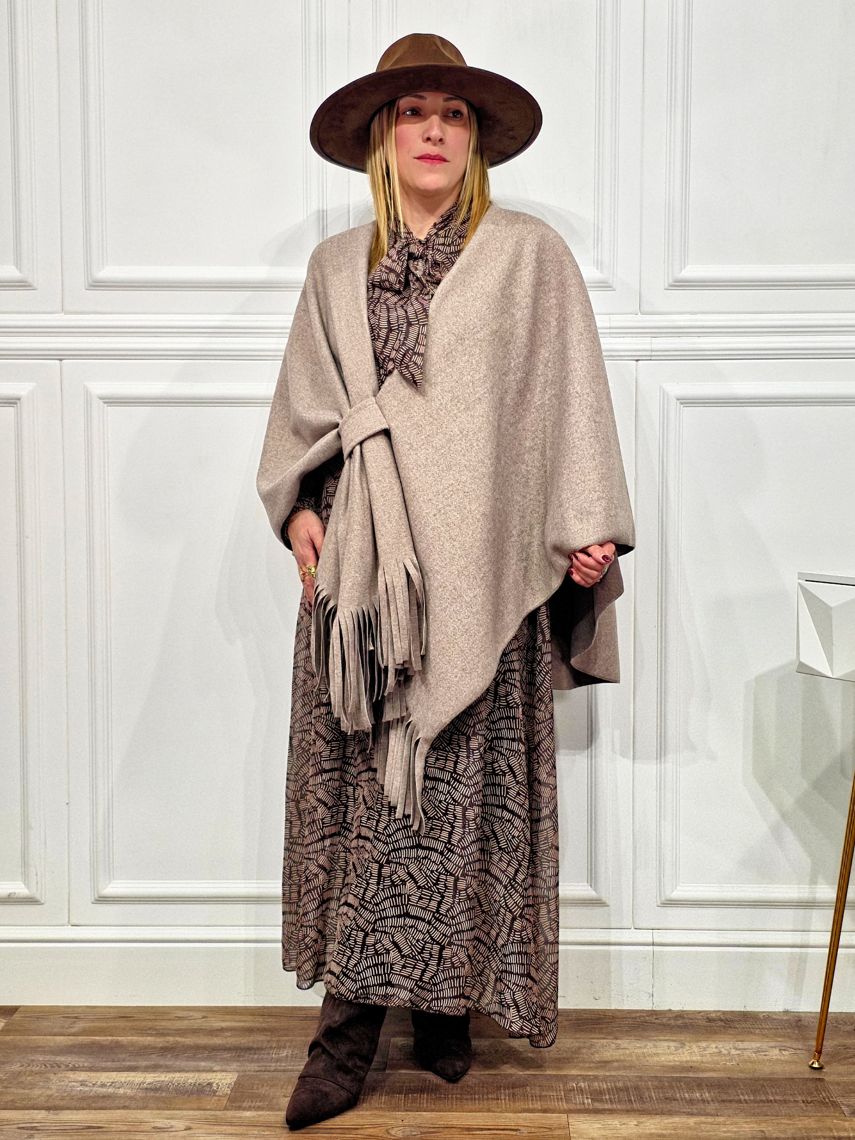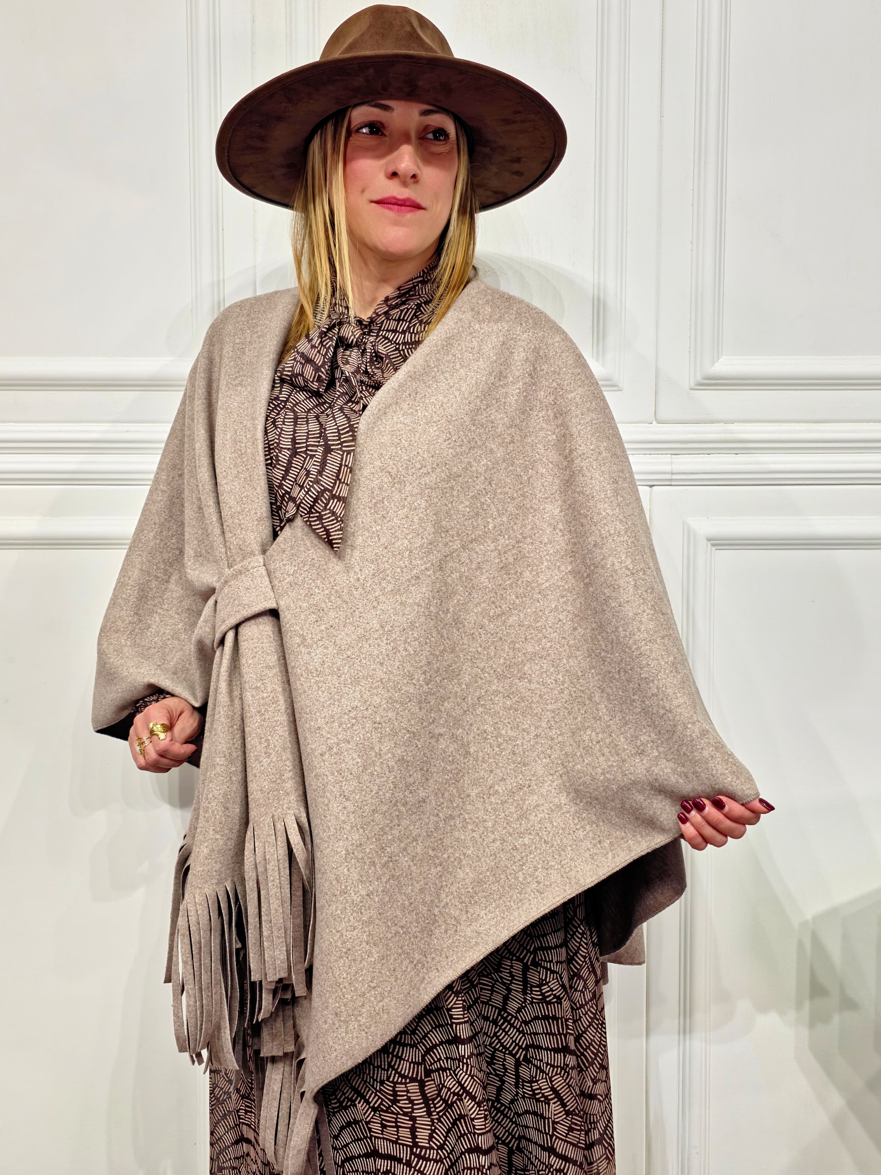 Un capo avvolgente e sofisticato, perfetto per completare look eleganti e casual-chic. La mantella presenta un nodo frontale che dona struttura e femminilità, mentre le frange sul fondo aggiungono movimento e stile. Realizzata in un mix di lana e viscosa, garantisce calore e comfort senza rinunciare all’eleganza.