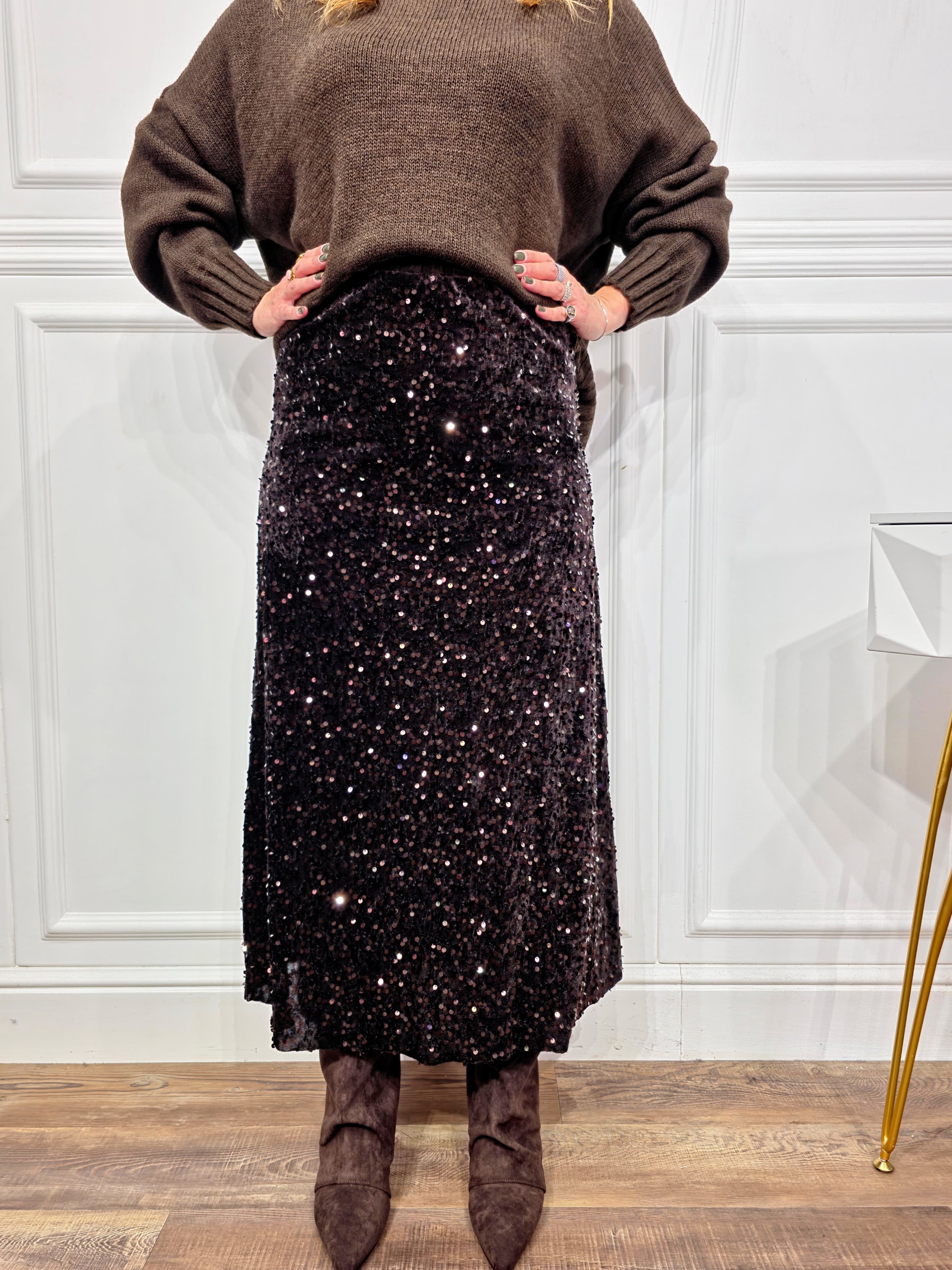 Una gonna luminosa e di grande impatto, perfetta per look da sera o outfit speciali. Il modello è caratterizzato da una lunghezza midi, completamente ricoperto di paillettes che riflettono la luce con eleganza. L’elastico in punto vita garantisce comfort e una vestibilità adattabile, rendendola ideale da abbinare sia a maglioni morbidi che a top più strutturati.