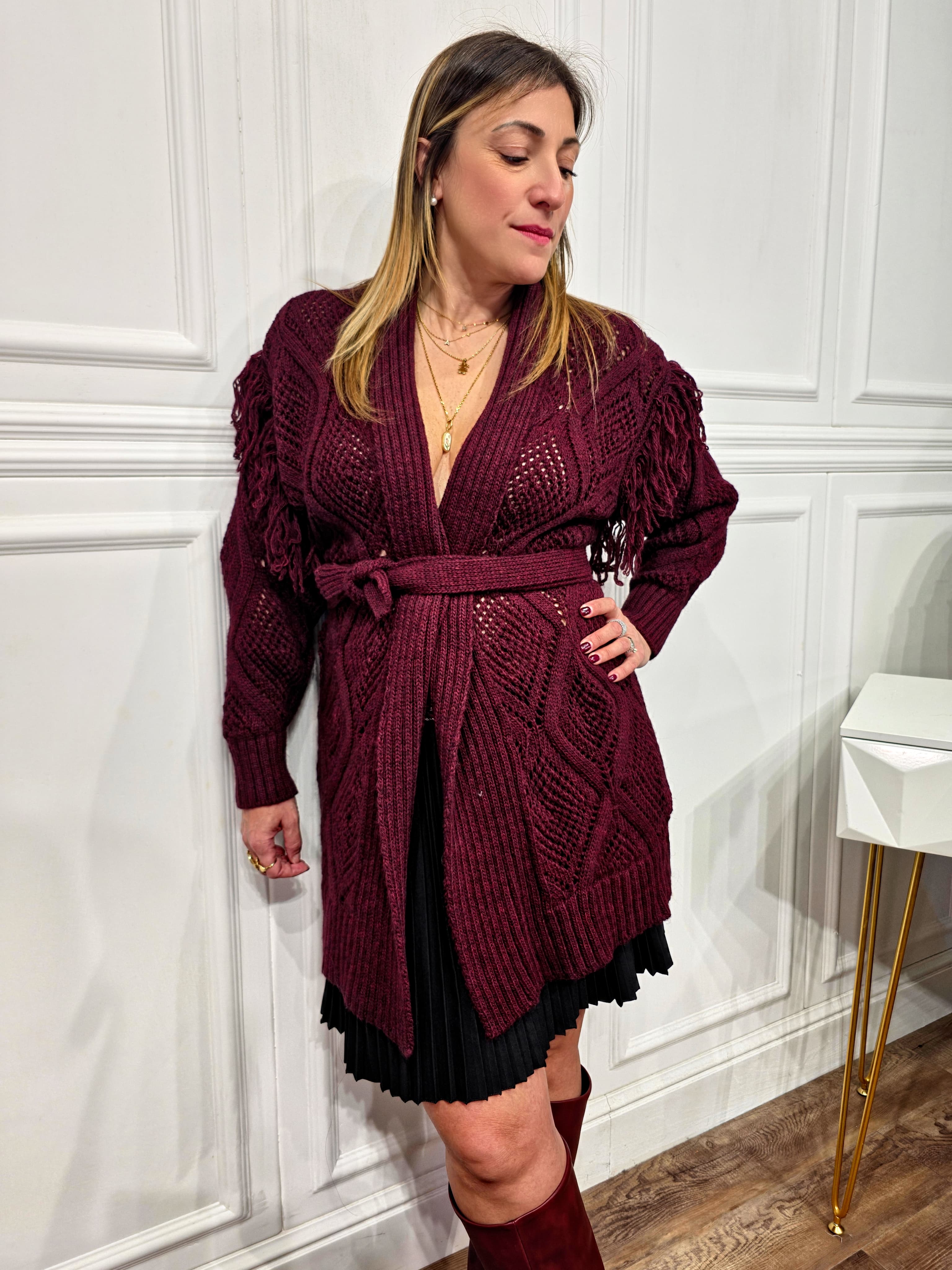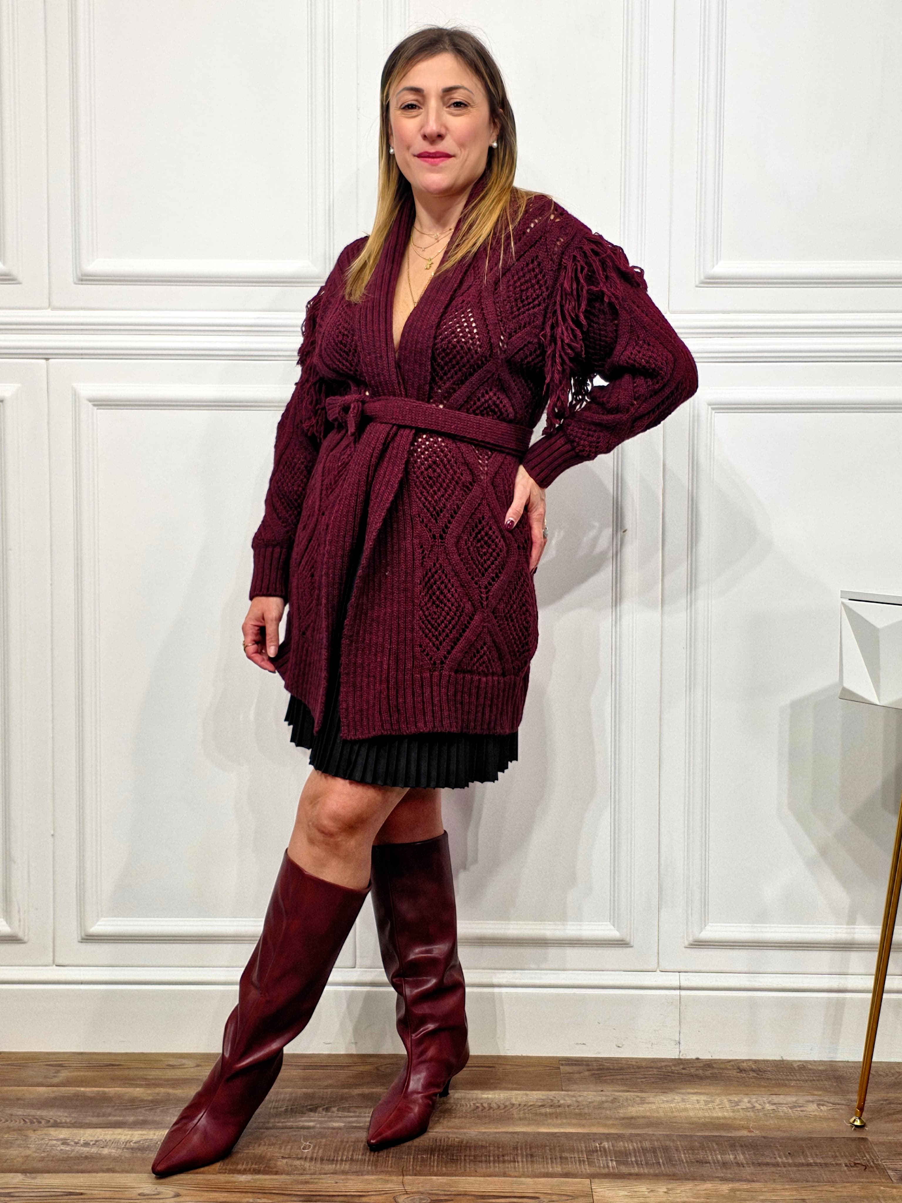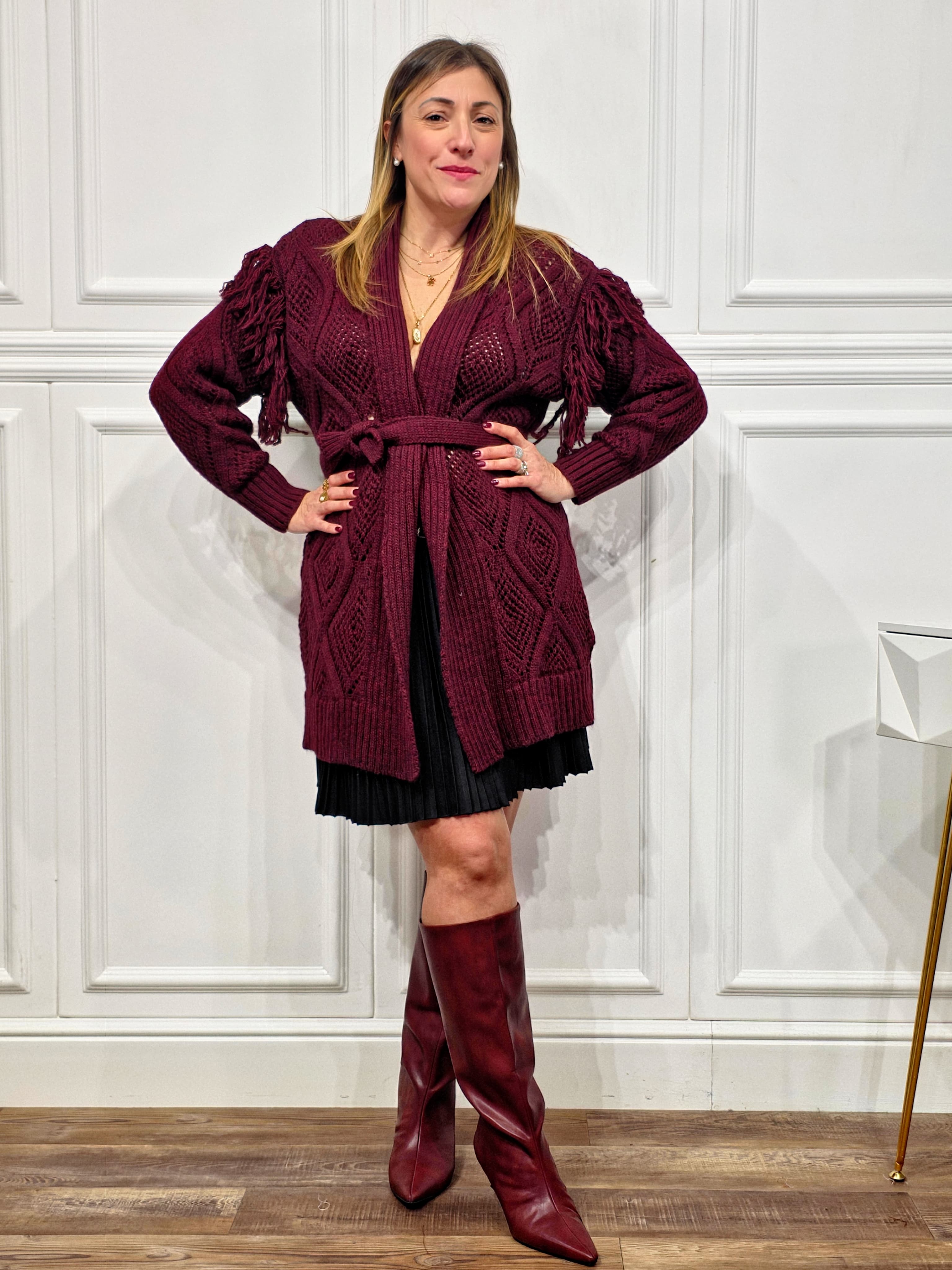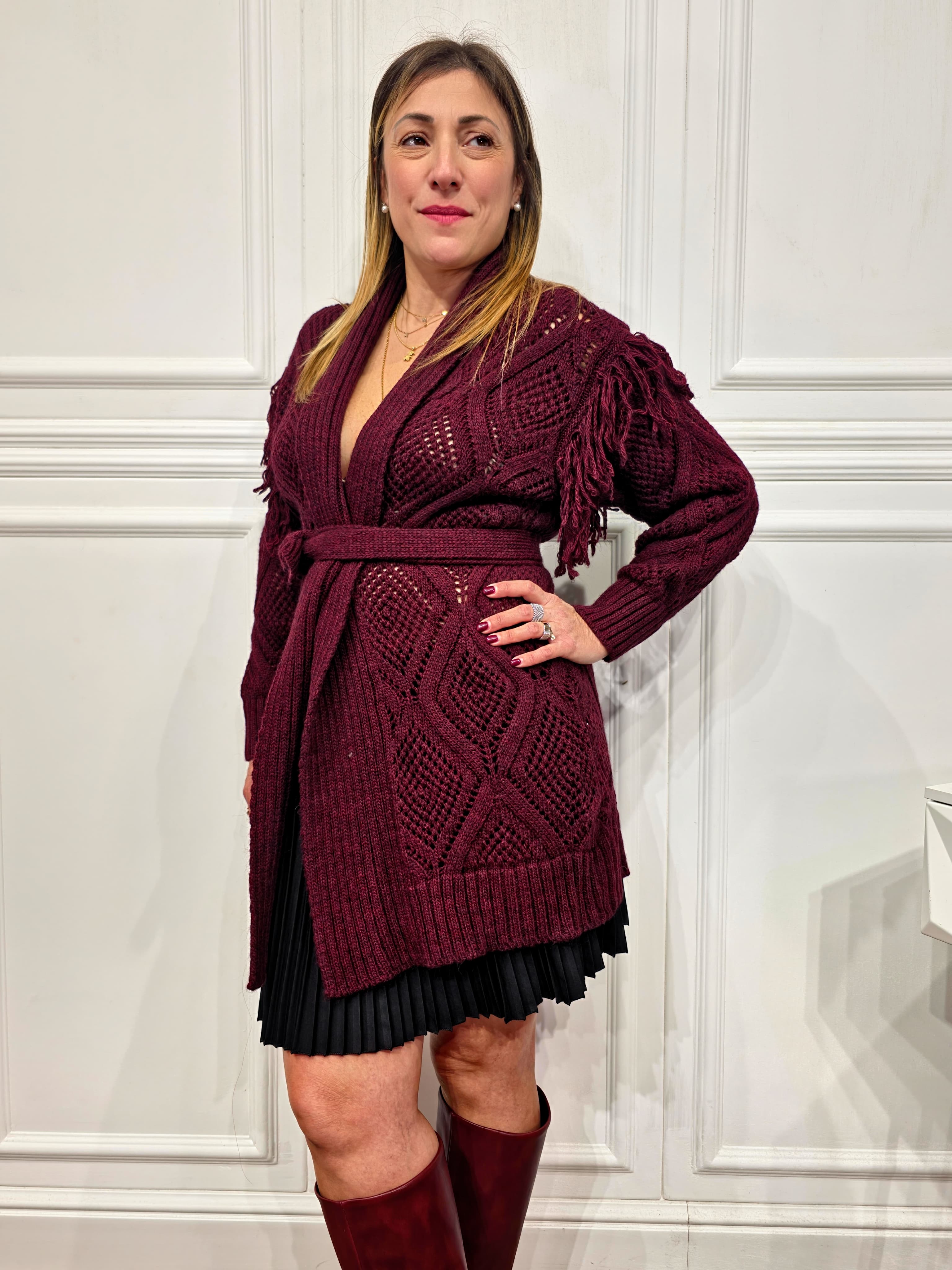 Un modello caldo e avvolgente che unisce stile e comfort. Il cardigan è caratterizzato da un lavoro traforato che dona leggerezza al tessuto, maniche arricchite da frange tono su tono per un tocco di originalità e una cintura in vita che permette di regolare la vestibilità e valorizzare la silhouette.