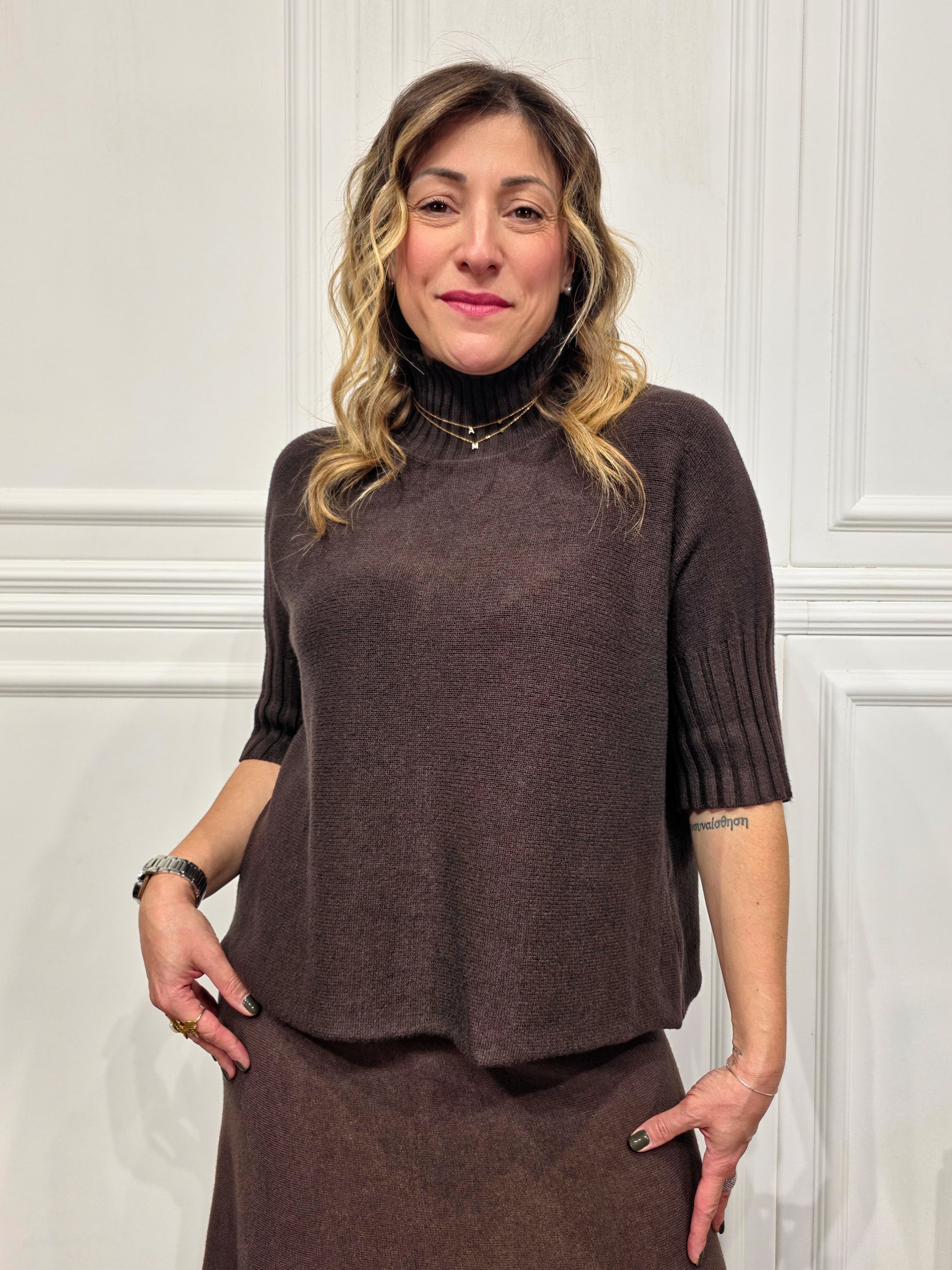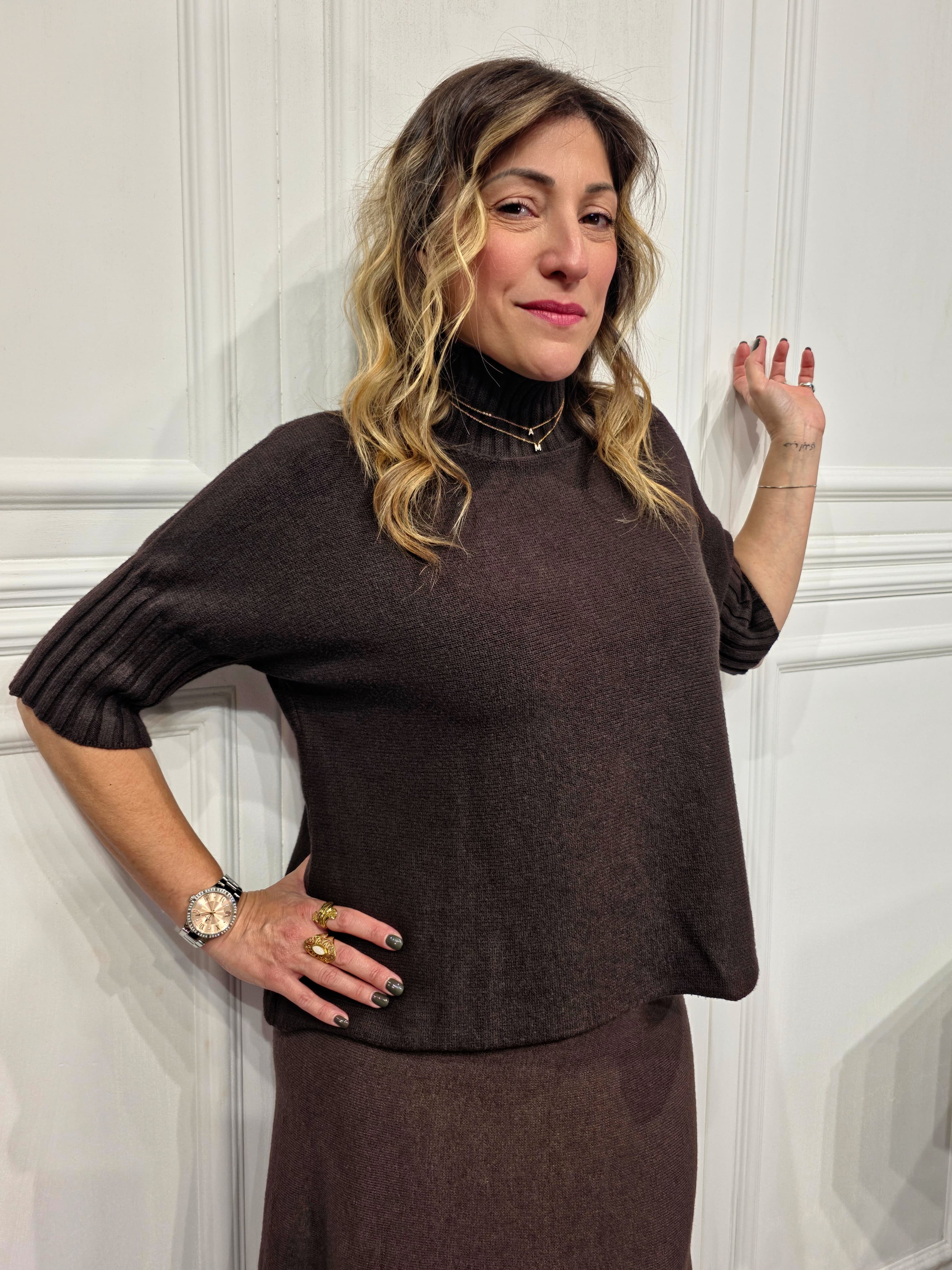 Un capo moderno e minimal, pensato per offrire comfort e stile in ogni occasione. Il pull è caratterizzato da un collo vulcano morbido, una manica 3/4 con lavorazione a costine e un taglio squadrato che dona una vestibilità ampia e contemporanea. Perfetto da indossare da solo o come base per look a strati.