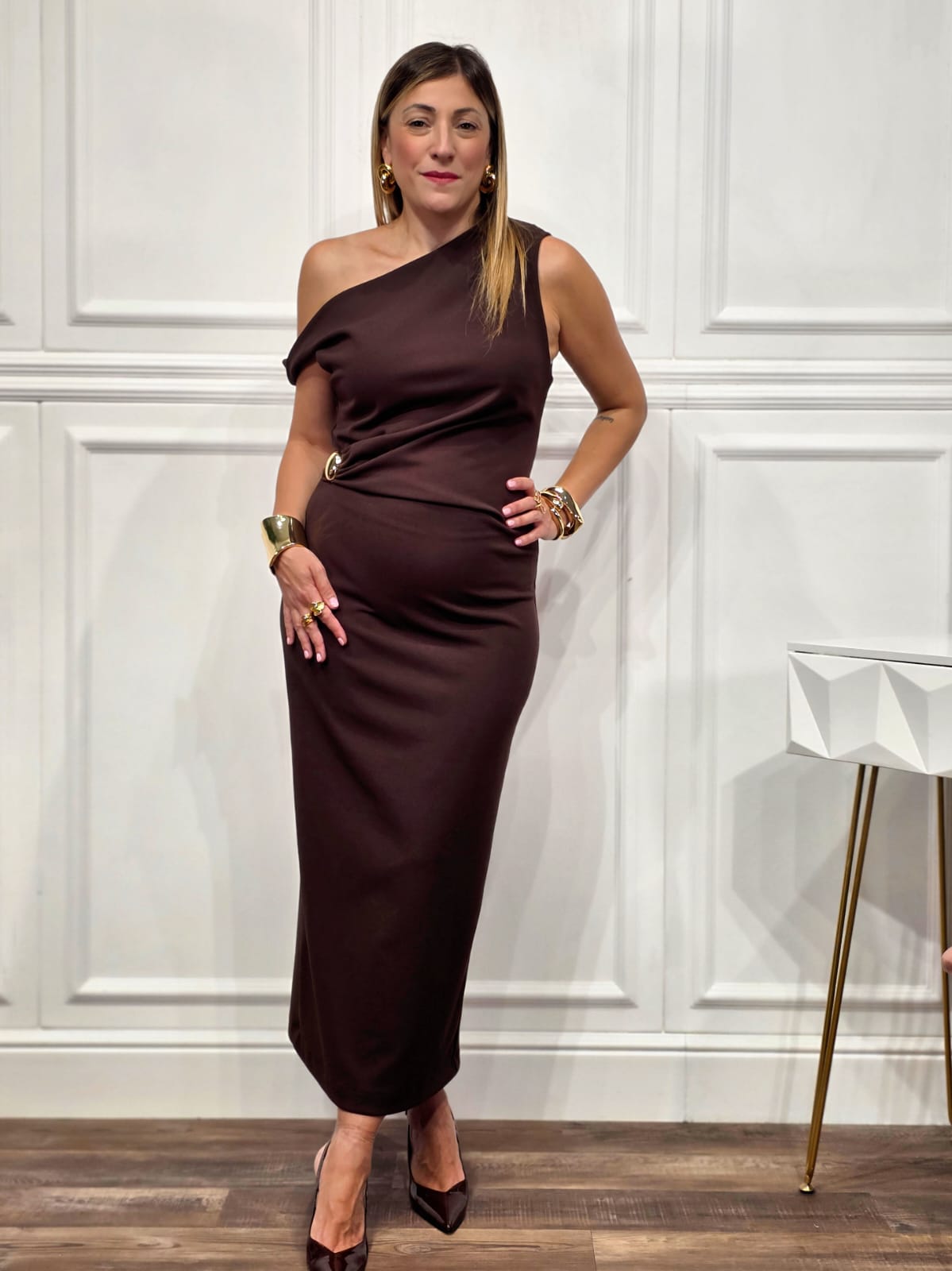 Abito lungo stretch con elegante collo a gronda e spalla scoperta. Caratterizzato da un raffinato dettaglio dorato laterale che valorizza il punto vita.