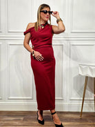 Abito lungo  stretch con elegante collo a gronda e spalla scoperta. Caratterizzato da un raffinato dettaglio dorato laterale che valorizza il punto vita.