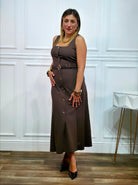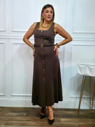 Abito midi in tessuto stretch, con scollatura quadrata, bottoni dorati decorativi sul davanti e cintura in vita coordinata con fibbia gioiello. La linea svasata valorizza la figura, mentre il tessuto in viscosa elasticizzata garantisce comfort e vestibilità perfetta.