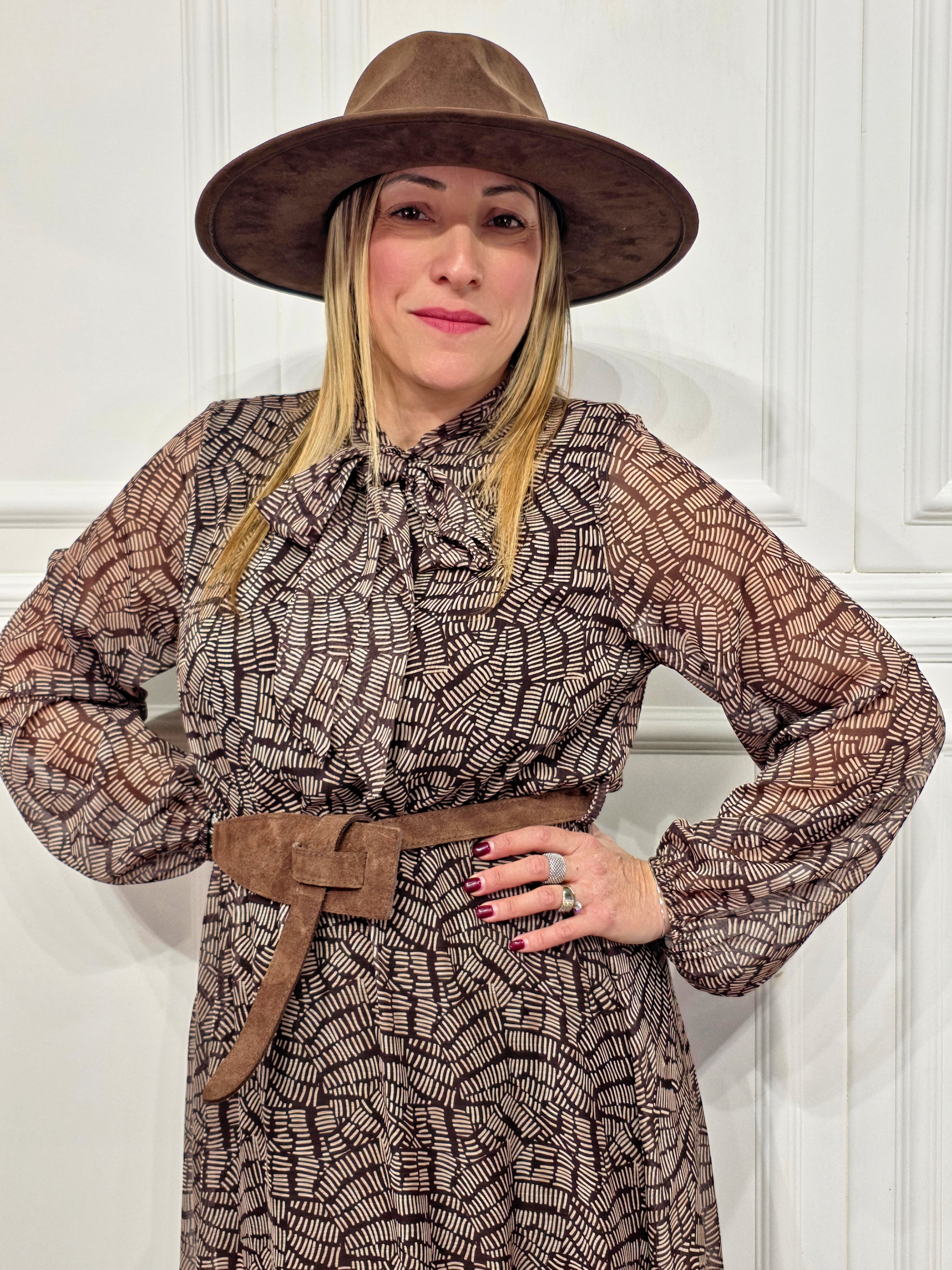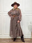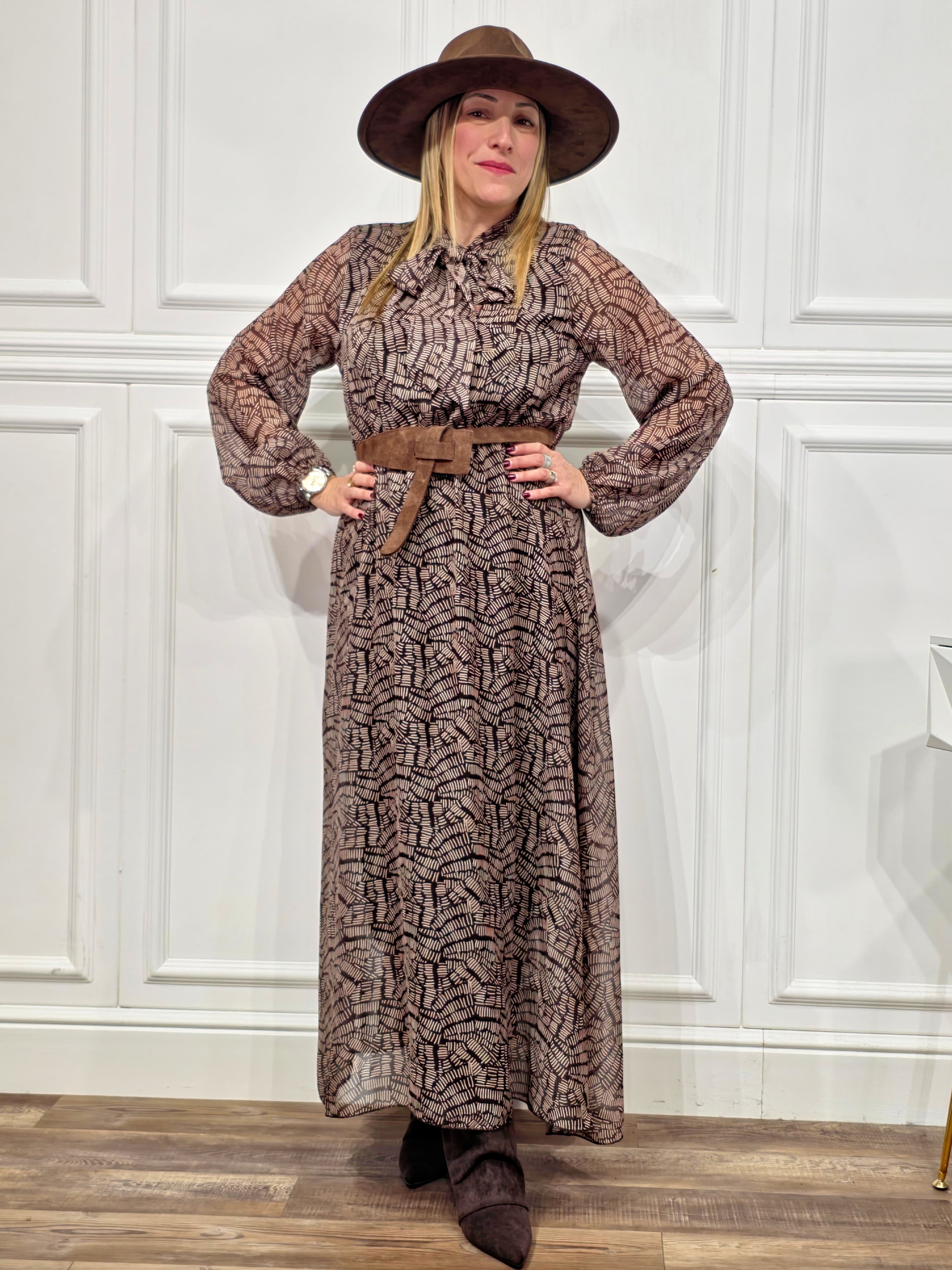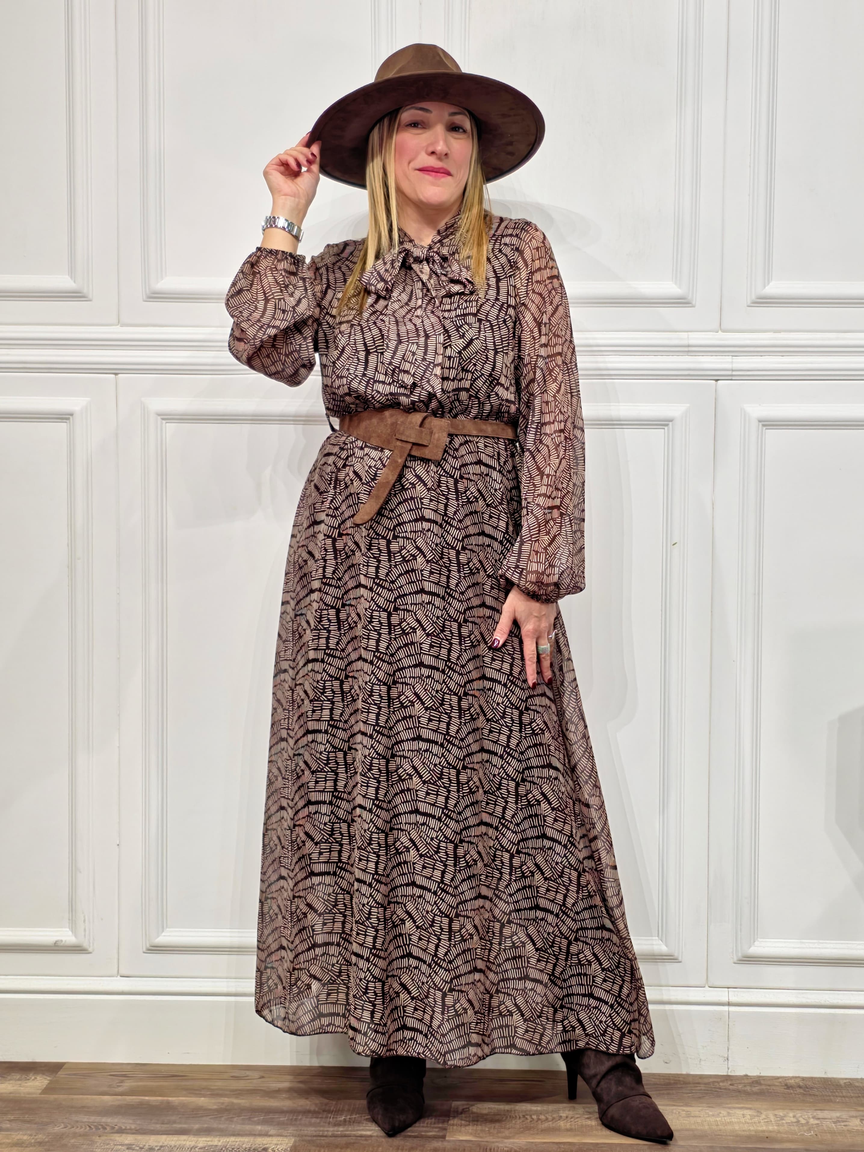 Abito lungo con fiocco al collo, elastico in vita e gonna morbida che accompagna i movimenti con leggerezza. La linea fluida valorizza la figura senza costringerla, rendendolo ideale per diverse occasioni.