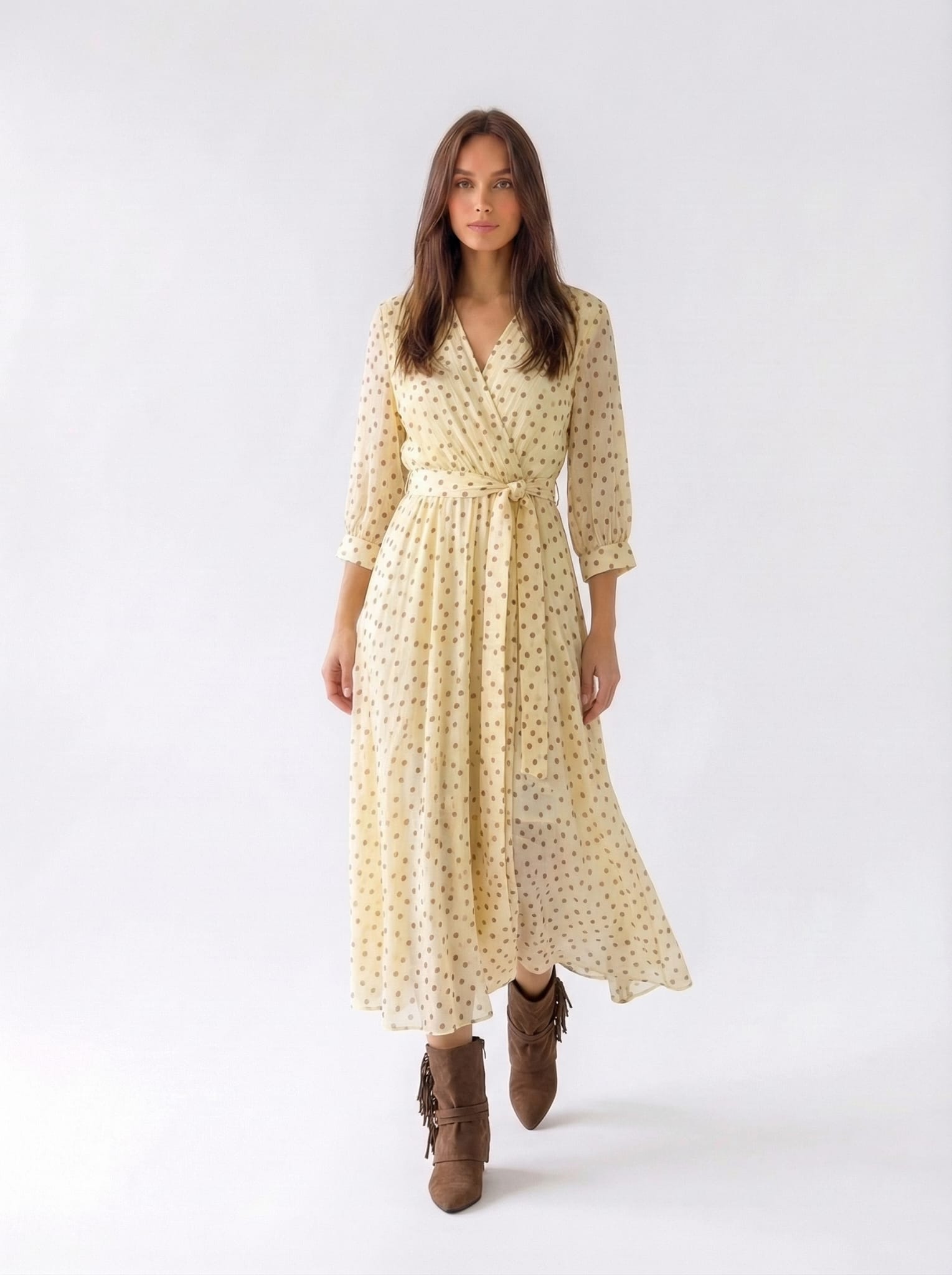 Abito in tencel leggero e fluido, caratterizzato da una fantasia pois delicata che dona luminosità e movimento al look.