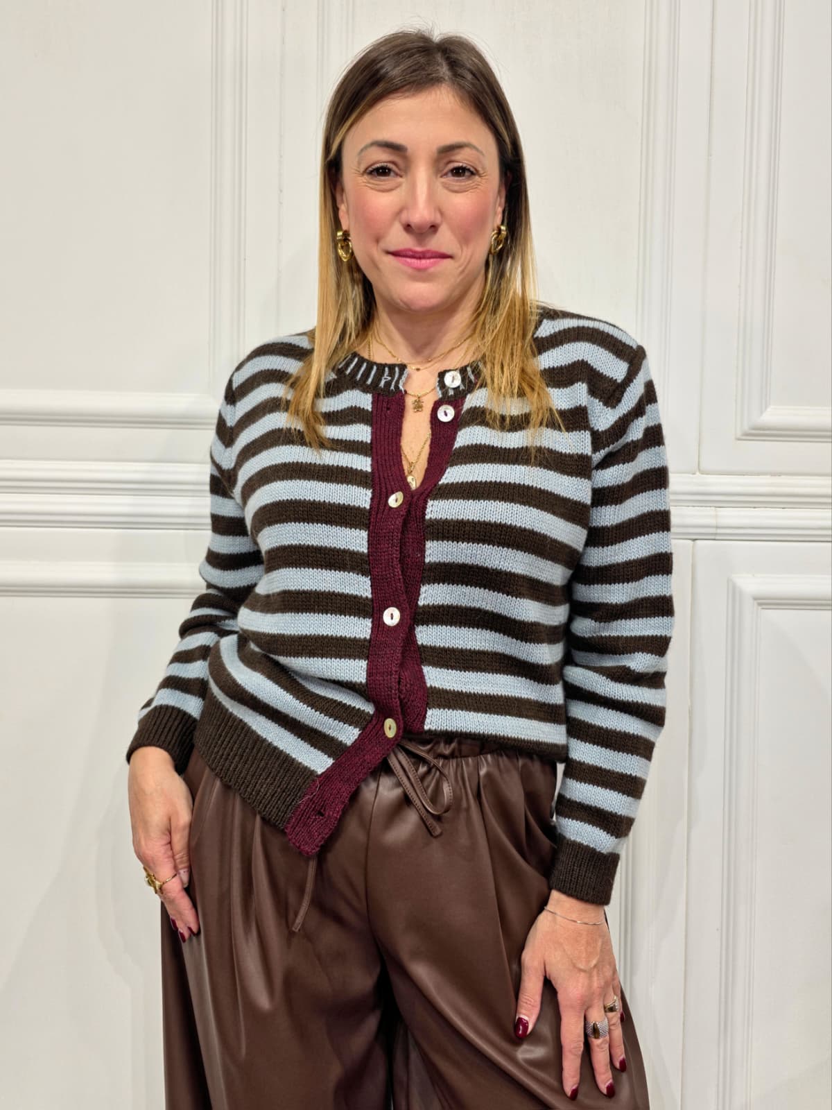 Cardigan paricollo rigato con bottoni effetto madreperla