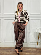 Cardigan paricollo rigato con bottoni effetto madreperla