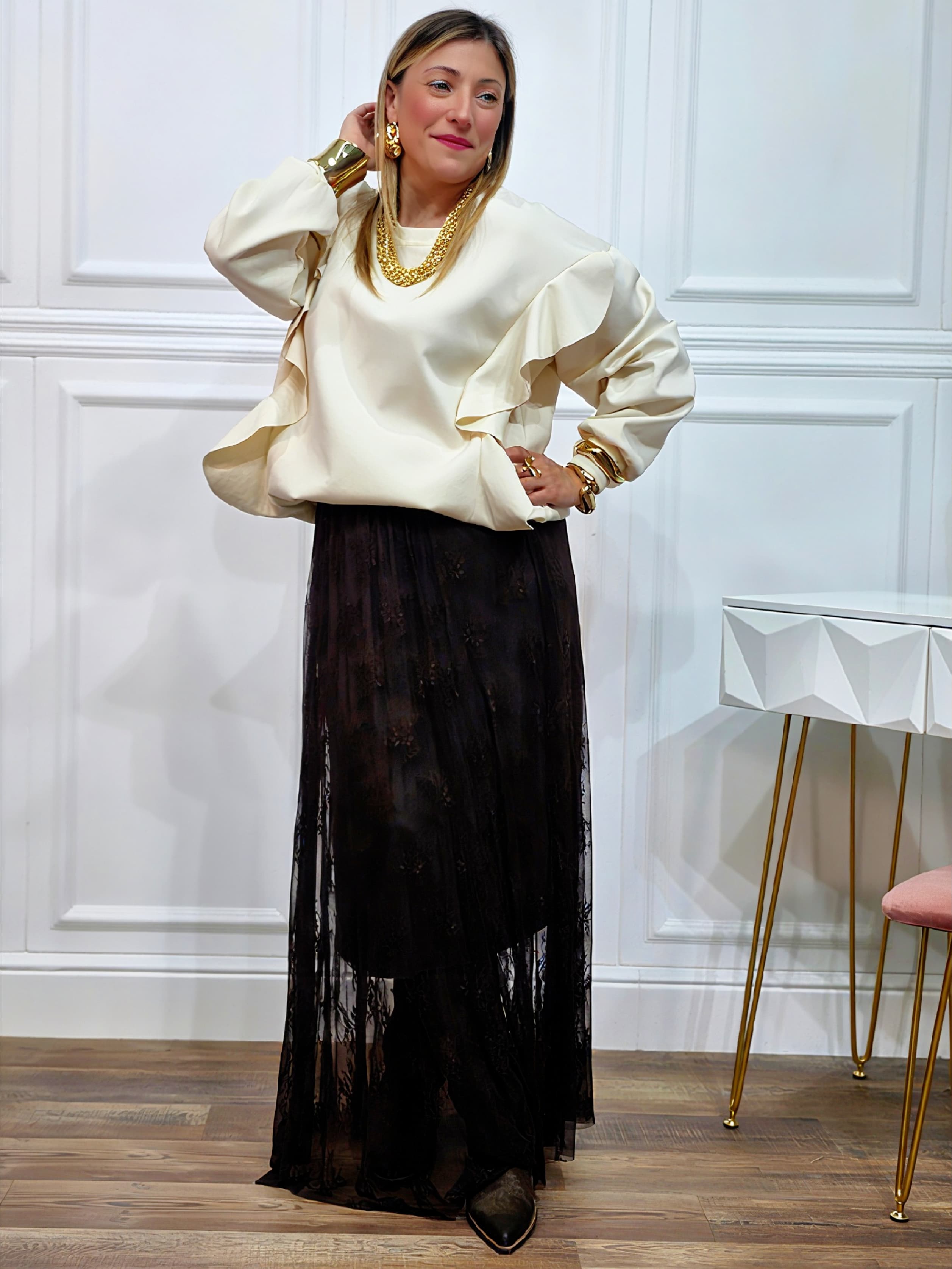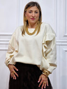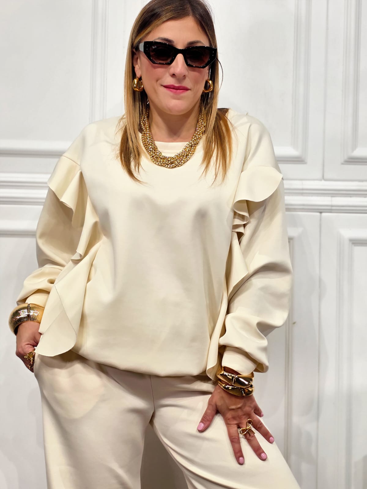 Felpa in cotone dal taglio morbido con collo tondo e rouche applicate sui lati e lungo le maniche, per un tocco femminile e originale anche nei look più casual.