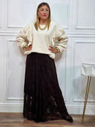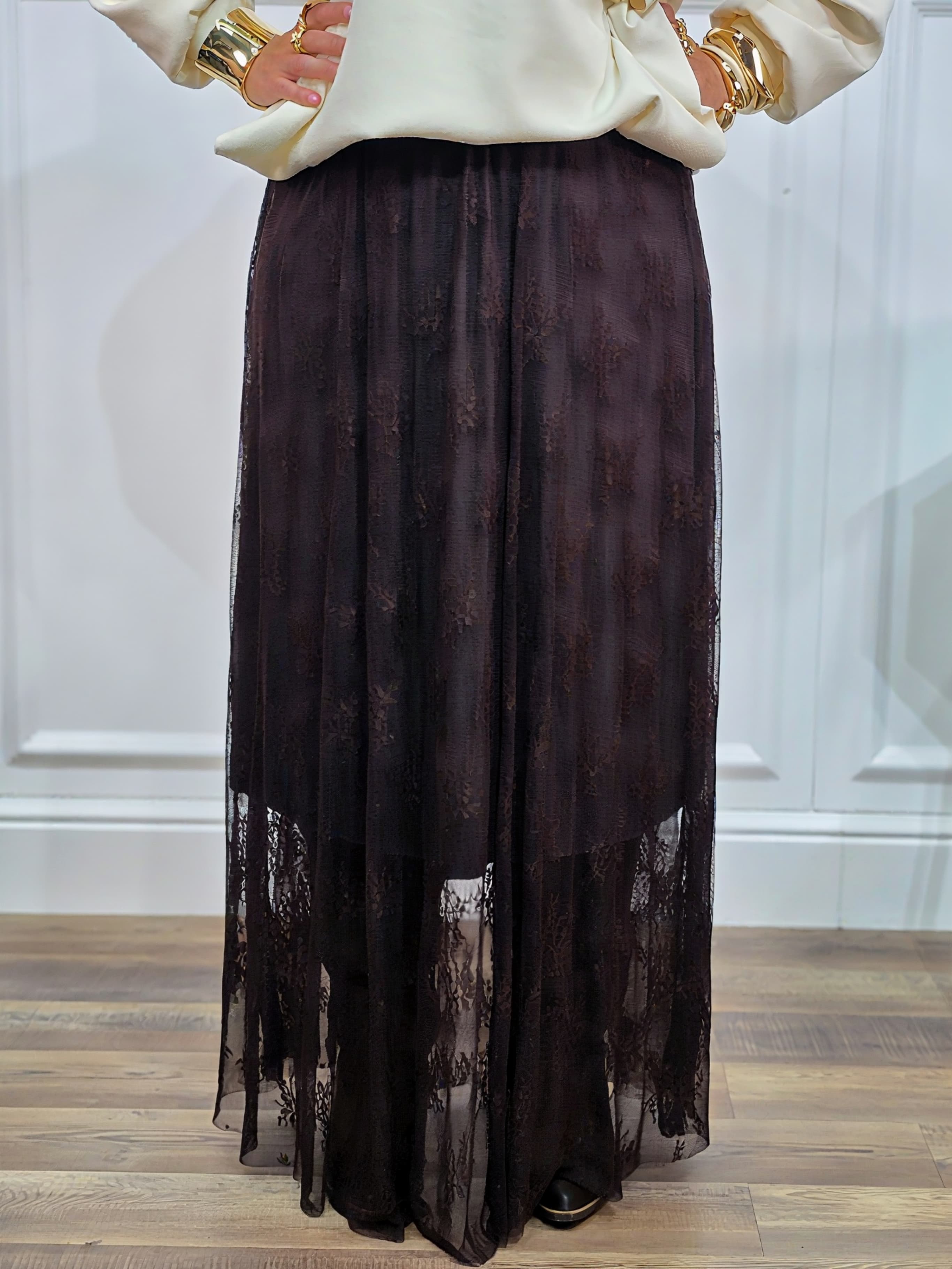 Gonna lunga in pizzo semitrasparente con motivo floreale in rilievo, arricchita da una comoda fascia elastica in vita e sottogonna interna corta tono su tono. Il tessuto leggero e fluido crea un effetto vedo-non-vedo elegante e sensuale.