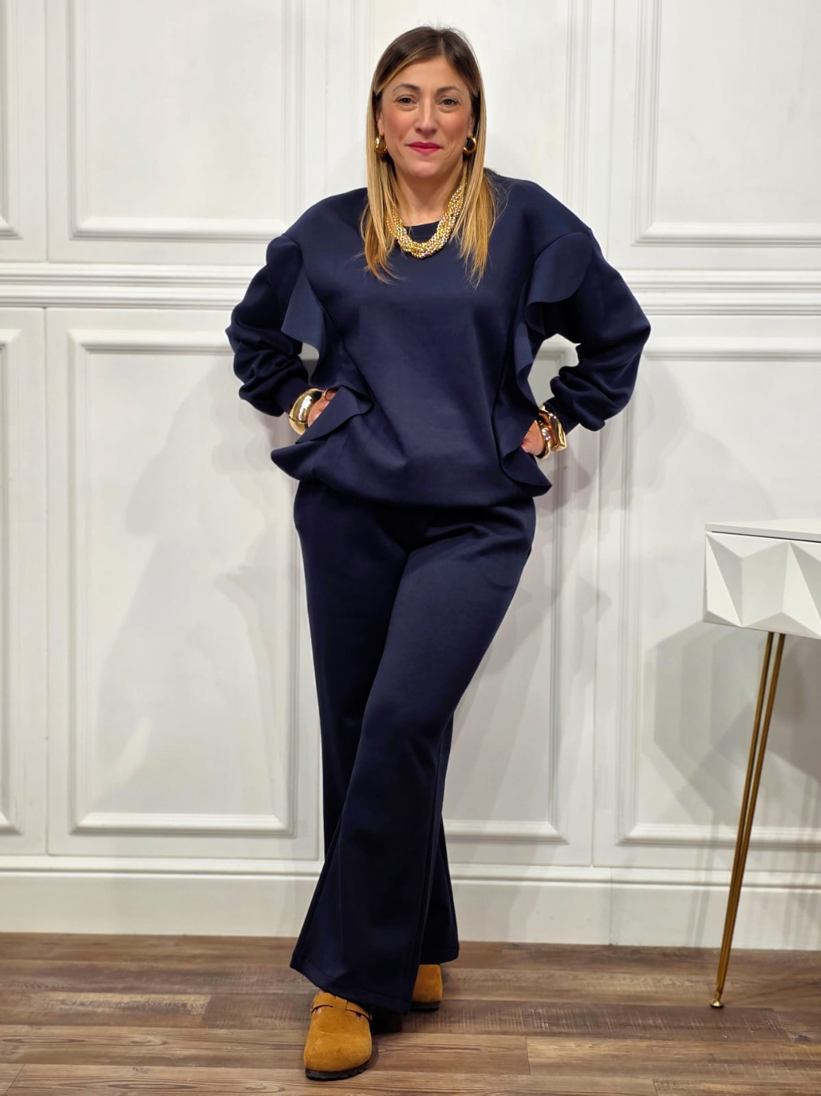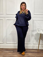Pantalone a gamba ampia in morbido cotone felpato, con vita elasticizzata e linea scivolata. Un capo confortevole ma curato nei dettagli, pensato per accompagnarti con stile dal relax casalingo all’uscita informale.