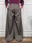 Elegante e strutturato, questo pantalone palazzo presenta pences frontali e abbottonatura visibile. Il taglio ampio slancia la figura e dona un’allure sofisticata.
