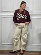 Un maglione morbido, caldo e super trendy. La sua linea a scatola dona un fit comodo e moderno, mentre il paricollo classico e la maxi scritta “Love” a contrasto aggiungono un tocco casual e romantico. Perfetto per look quotidiani, da indossare sia su jeans che su pantaloni più eleganti.