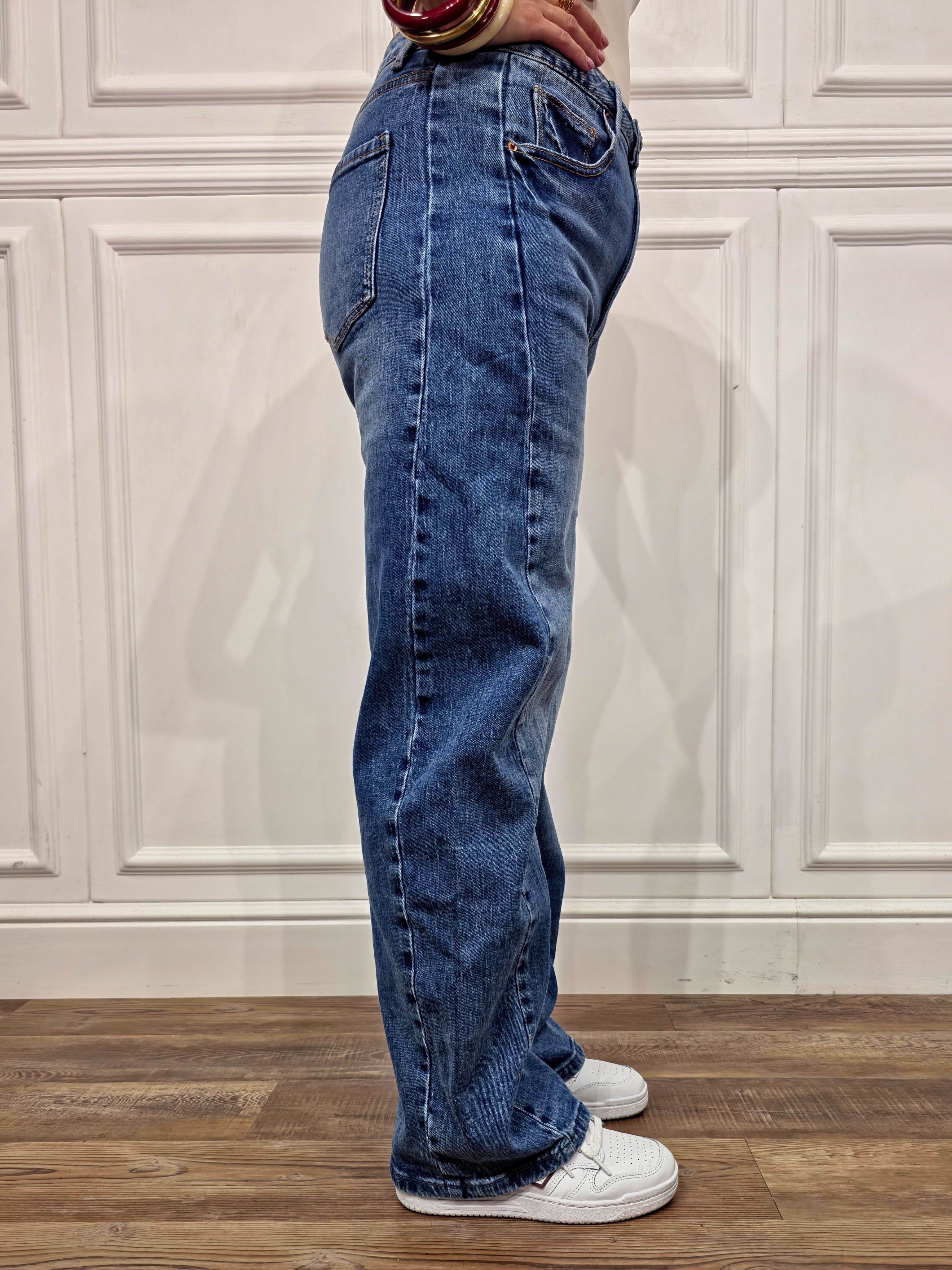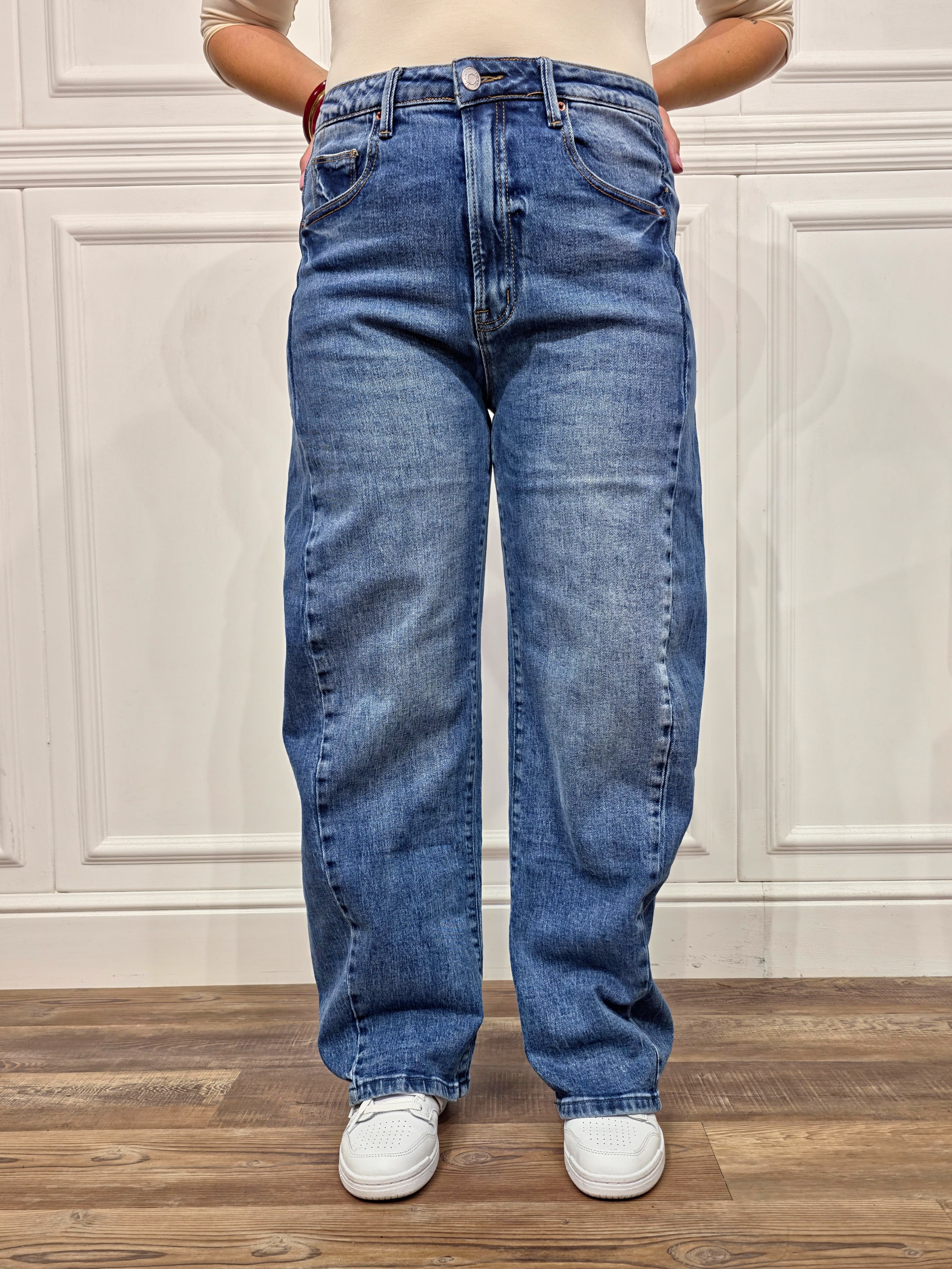 Jeans in denim 100% cotone, dal taglio baggie morbido con gamba ampia e vita alta.