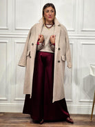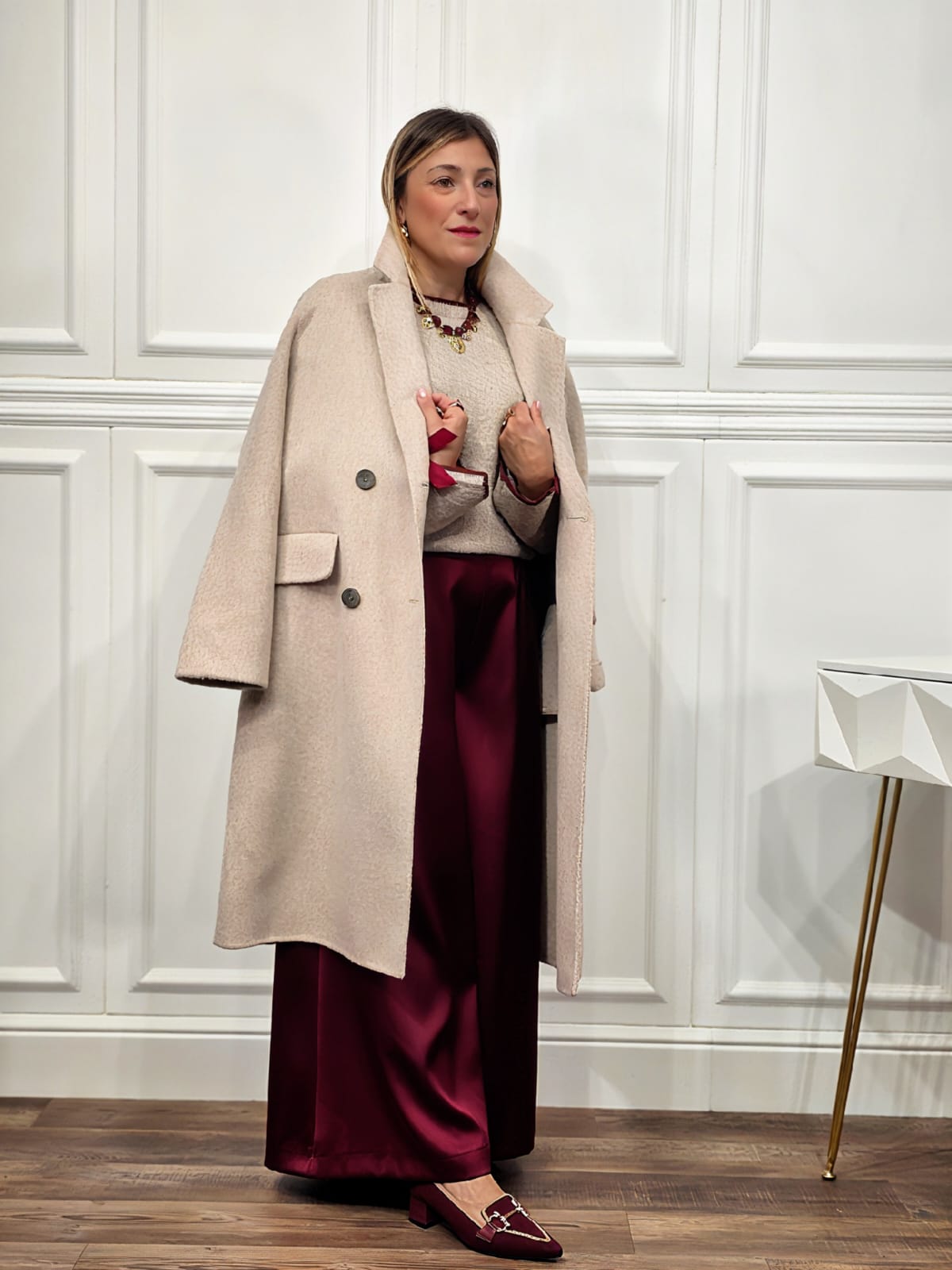 Pantalone e a gamba larga in raso fluido, con vita elasticizzata sul retro per un fit comodo e versatile.