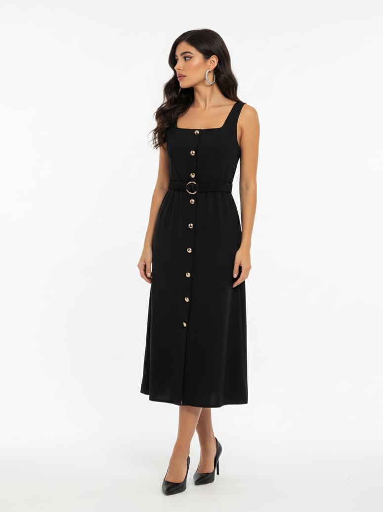Abito midi in tessuto stretch, con scollatura quadrata, bottoni dorati decorativi sul davanti e cintura in vita coordinata con fibbia gioiello. La linea svasata valorizza la figura, mentre il tessuto in viscosa elasticizzata garantisce comfort e vestibilità perfetta.