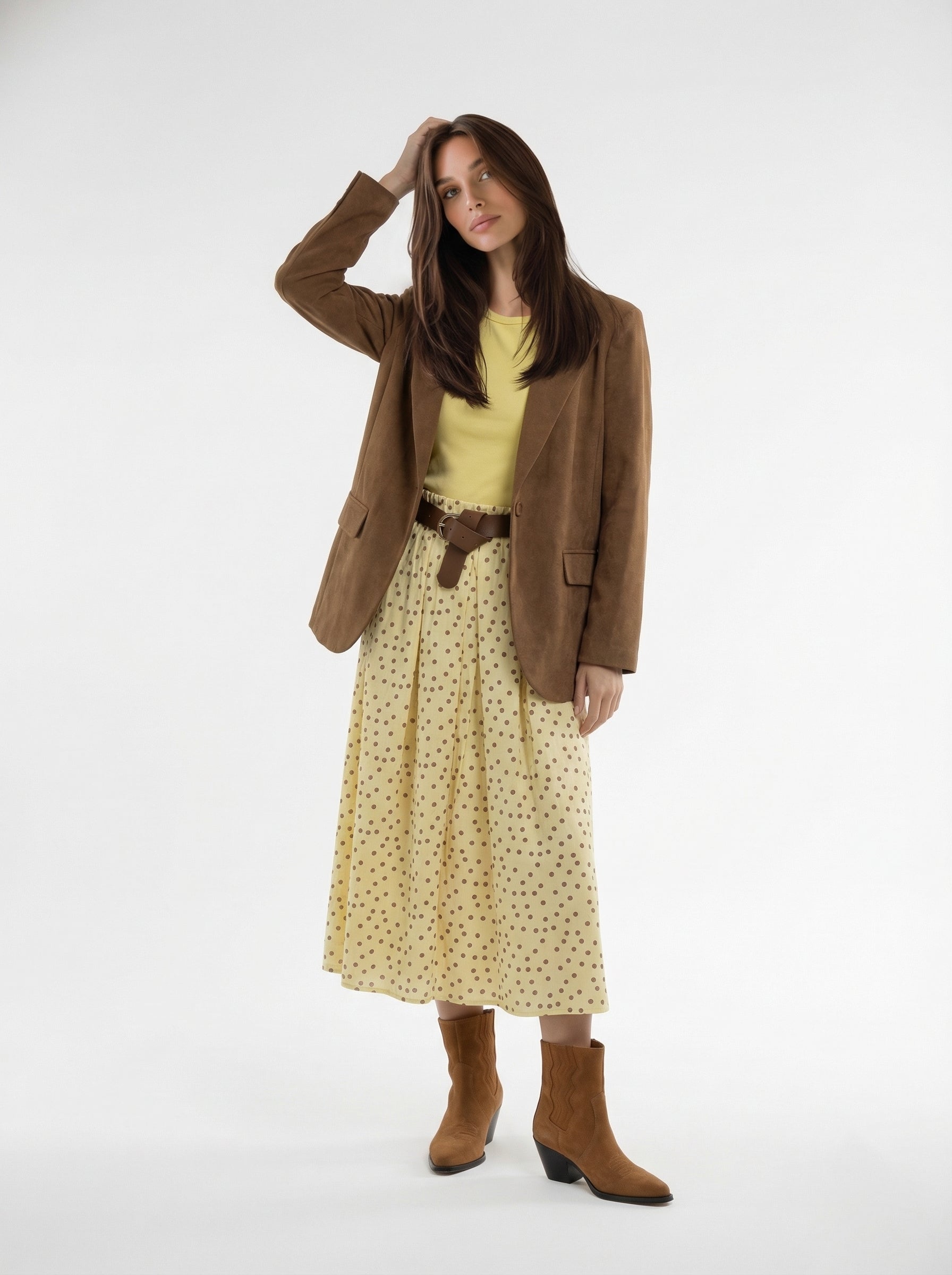 Gonna midi dal design femminile e leggero, realizzata in cotone con delicata stampa pois che dona movimento e carattere al look. La linea fluida valorizza la silhouette mentre l’elastico sul retro garantisce comfort e vestibilità perfetta.