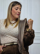 La modella è alta 160 cm e indossa la taglia unica (veste comodamente dalla 40 alla 44).
