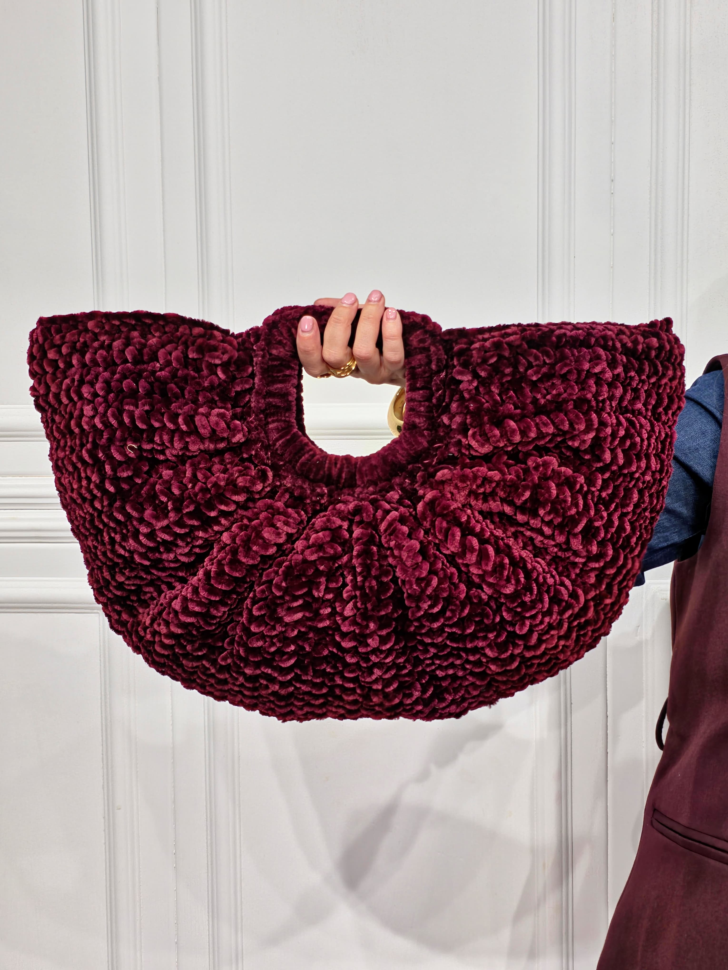 Borsa effetto cocoon in velluto intrecciato bordeaux, con manico rigido tono su tono integrato nella struttura. Morbida al tatto ma d’impatto nella forma, è l’accessorio perfetto per elevare qualsiasi look.