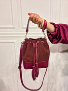 Borsa a secchiello in doppio materiale: suede e similpelle effetto grana, nei toni del bordeaux.