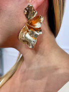 Orecchino in metallo color oro con design scultoreo a forma di foglia ginkgo, caratterizzato da superfici lavorate con effetto plissettato e giochi di luce.