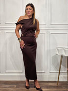Abito lungo stretch con elegante collo a gronda e spalla scoperta. Caratterizzato da un raffinato dettaglio dorato laterale che valorizza il punto vita.