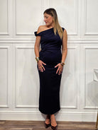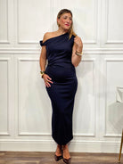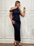 Abito lungo stretch con elegante collo a gronda e spalla scoperta. Caratterizzato da un raffinato dettaglio dorato laterale che valorizza il punto vita.