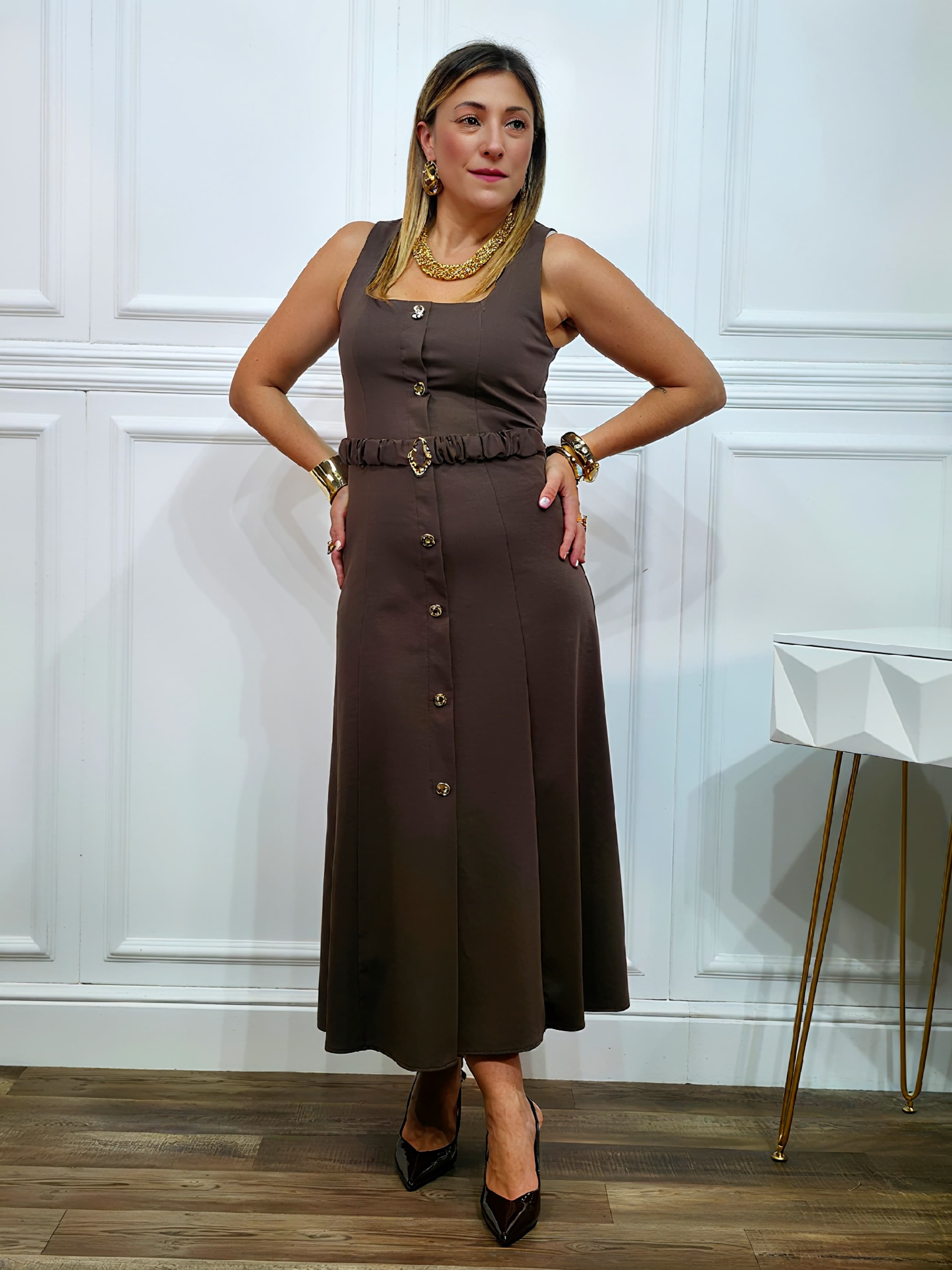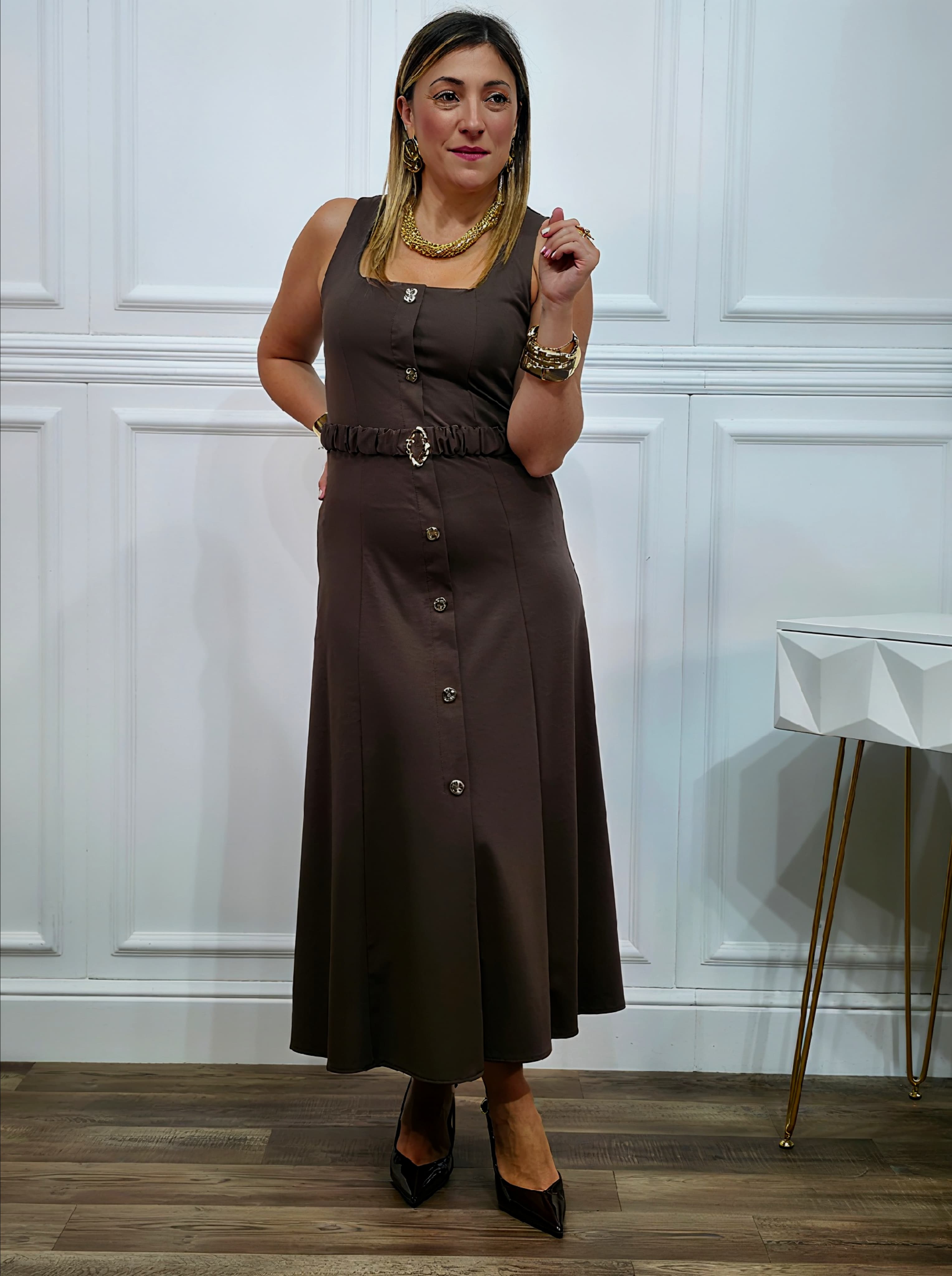 Abito midi in tessuto stretch, con scollatura quadrata, bottoni dorati decorativi sul davanti e cintura in vita coordinata con fibbia gioiello. La linea svasata valorizza la figura, mentre il tessuto in viscosa elasticizzata garantisce comfort e vestibilità perfetta.