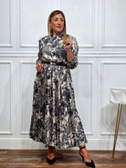 Abito lungo in viscosa con colletto classico, maniche lunghe e gonna plissettata che dona movimento e femminilità al look. La fantasia floreale ners su base avorio regala un’eleganza senza tempo, mentre la cintura nello stesso tessuto sottolinea delicatamente il punto vita.