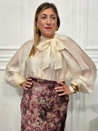 Blusa in tencell leggera effetto seta, con manica balloon e maxi fiocco da annodare sul collo. Elegante e luminosa, valorizza ogni look con un tocco sofisticato.