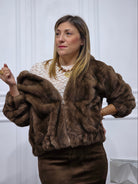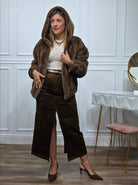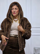 Morbida ecopelliccia effetto pelo corto, con linea bomber e zip frontale. Il modello è impreziosito da tasche laterali e da un ampio cappuccio che aggiunge un tocco cozy ma sofisticato.