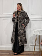 Trench lungo con stampa animalier, tasche laterali e cintura in vita. Il taglio classico viene reso attuale dalla fantasia maculata, perfetta per dare carattere a ogni look.