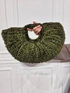 Borsa effetto cocoon in velluto intrecciato bordeaux, con manico rigido tono su tono integrato nella struttura. Morbida al tatto ma d’impatto nella forma, è l’accessorio perfetto per elevare qualsiasi look.