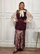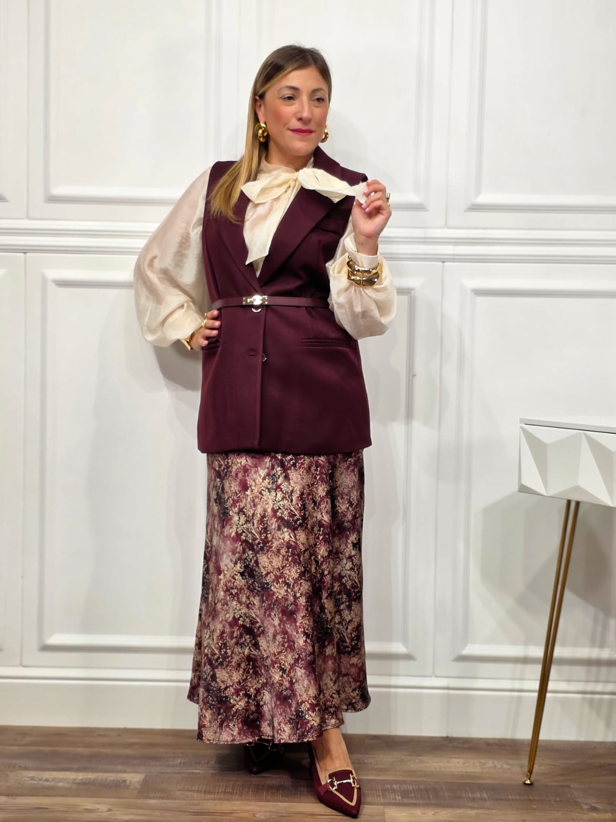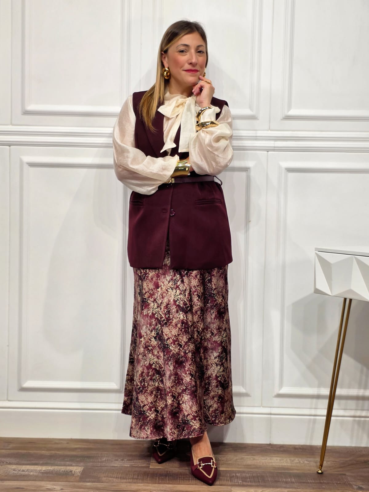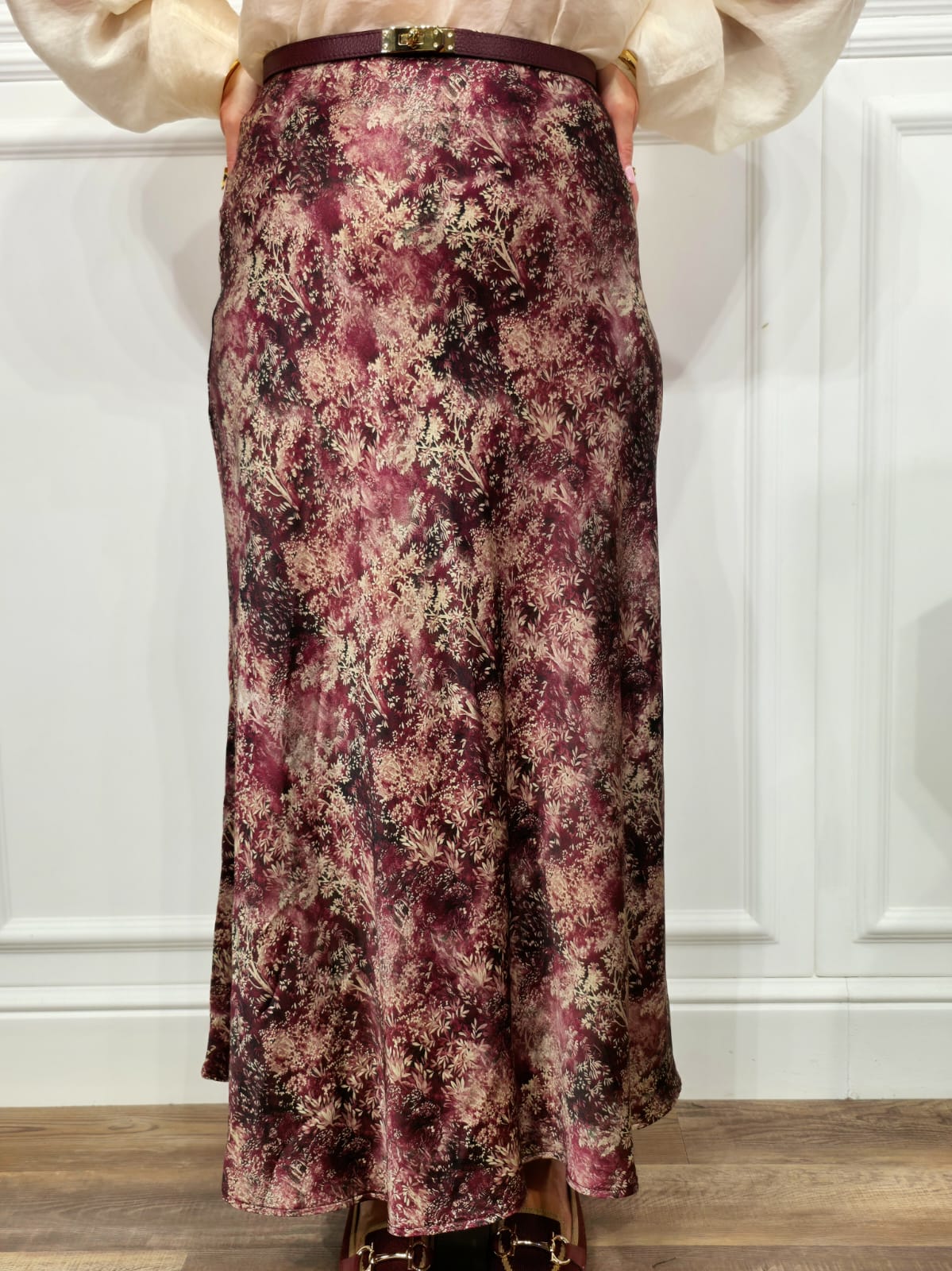 Gonna in viscosa fluida con stampa floreale nei toni del bordeaux, rosa cipria e nero. Linea morbida e scivolata, con elastico in vita per una vestibilità confortevole.