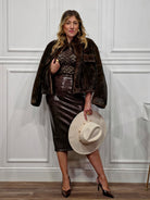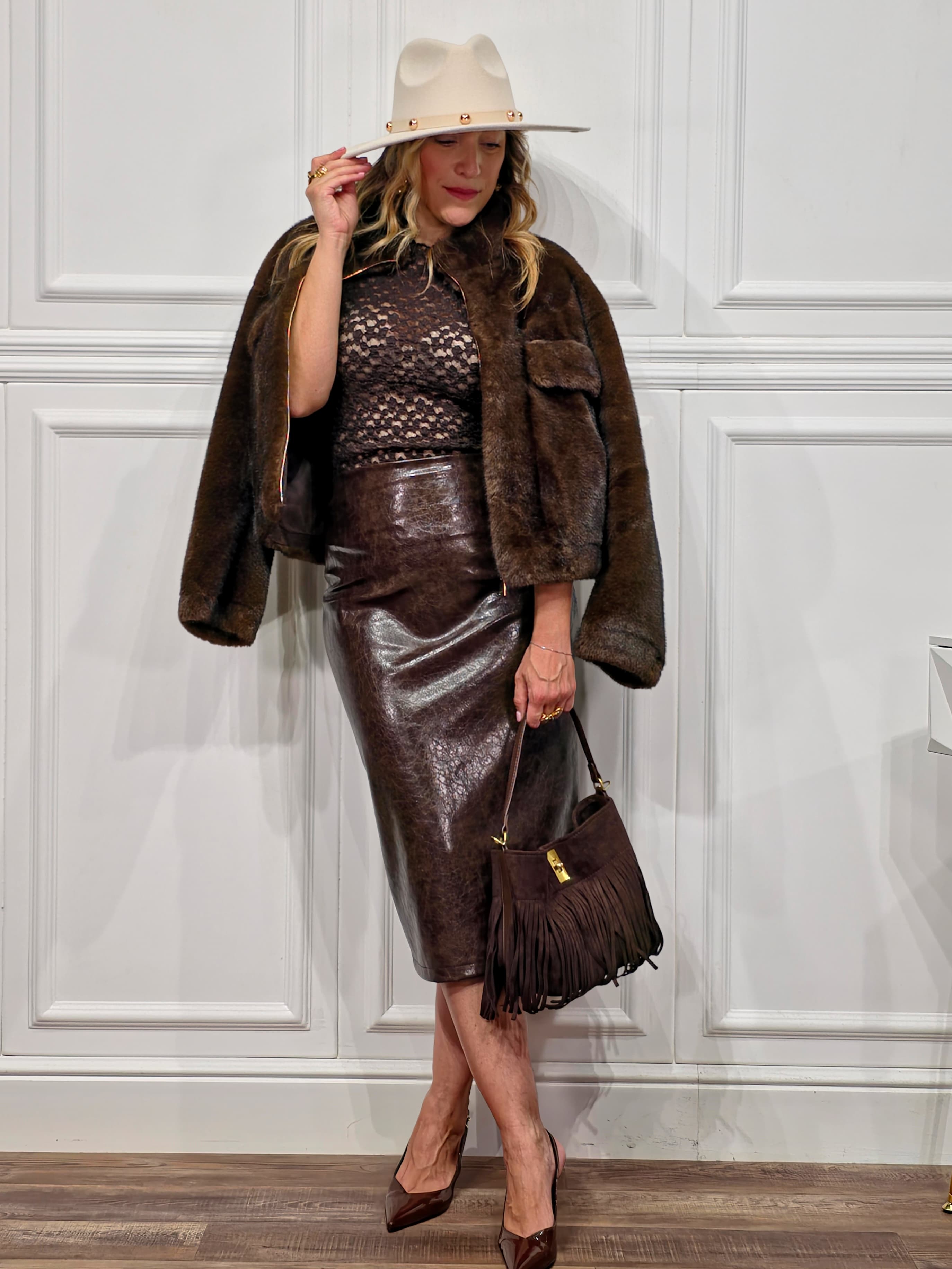 Gonna midi a tubino in ecopelle marrone con riflessi lucidi. Linea aderente, chiusura sul retro e vestibilità strutturata per valorizzare la silhouette.