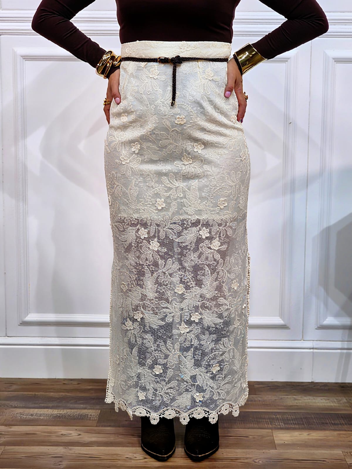 Gonna lunga in pizzo ricamato color panna, con delicati spacchi laterali e chiusura laterale nascosta. Femminile e raffinata, dona eleganza ad ogni passo grazie alla sua trasparenza studiata e alla lavorazione floreale.