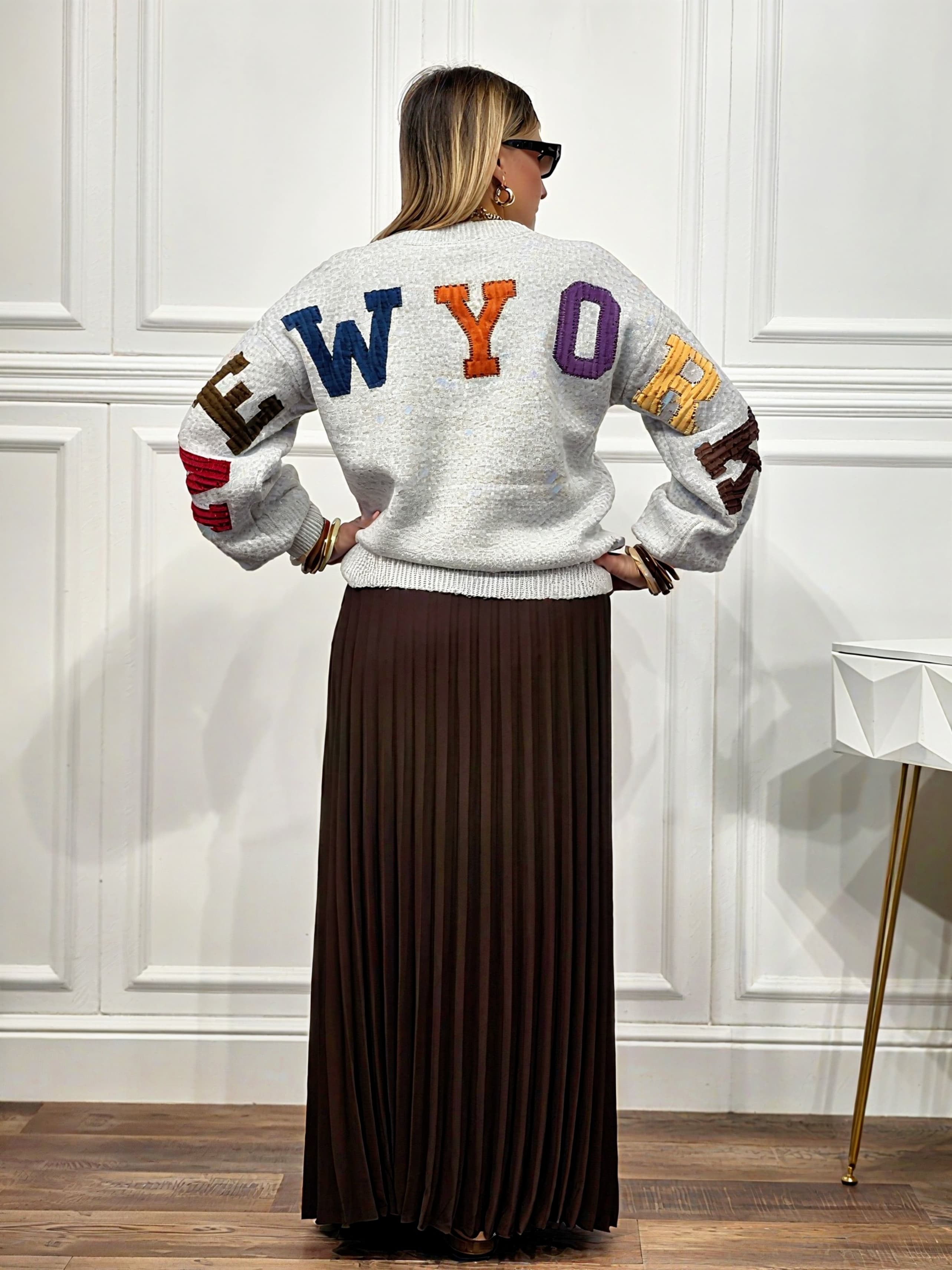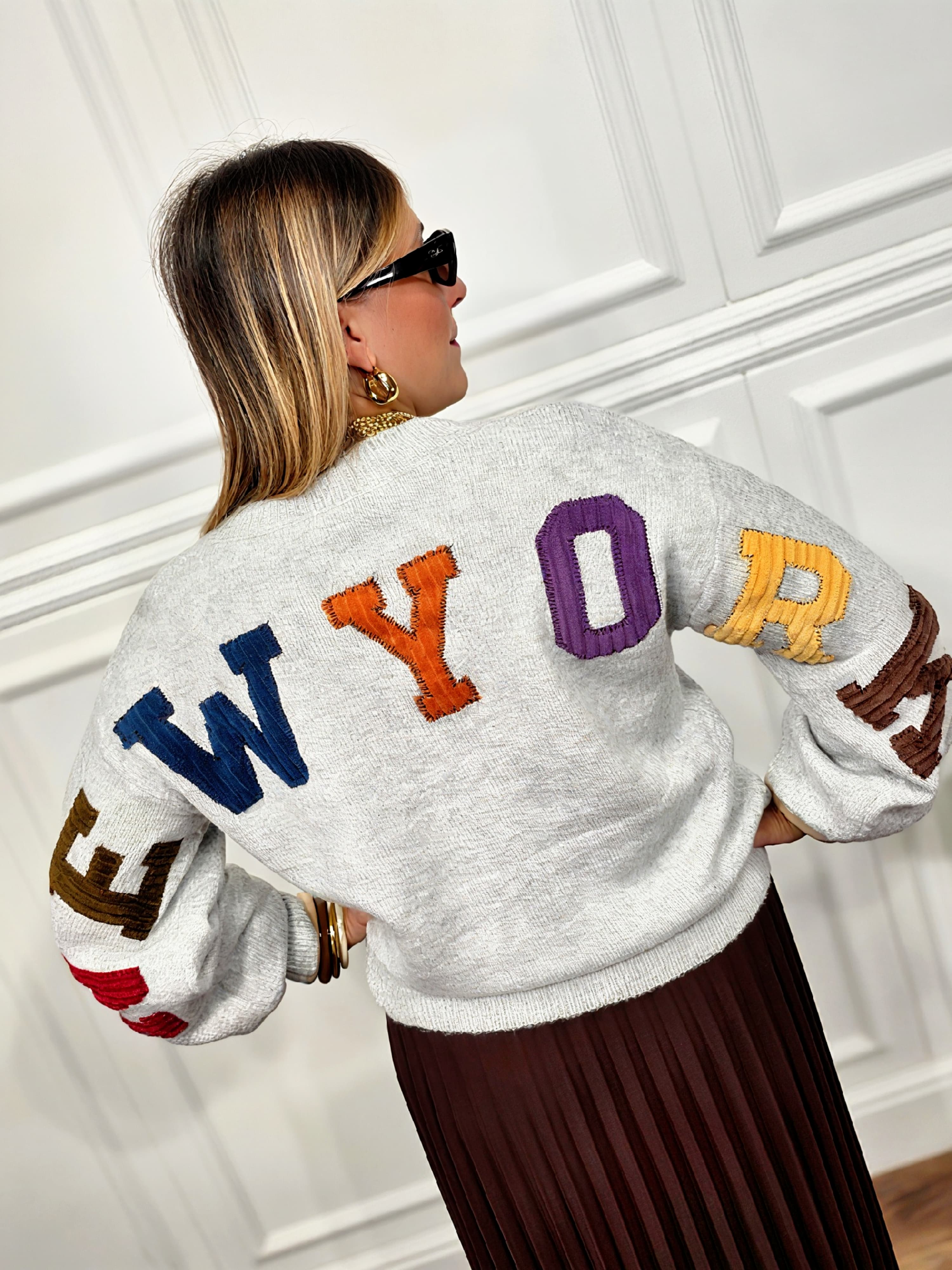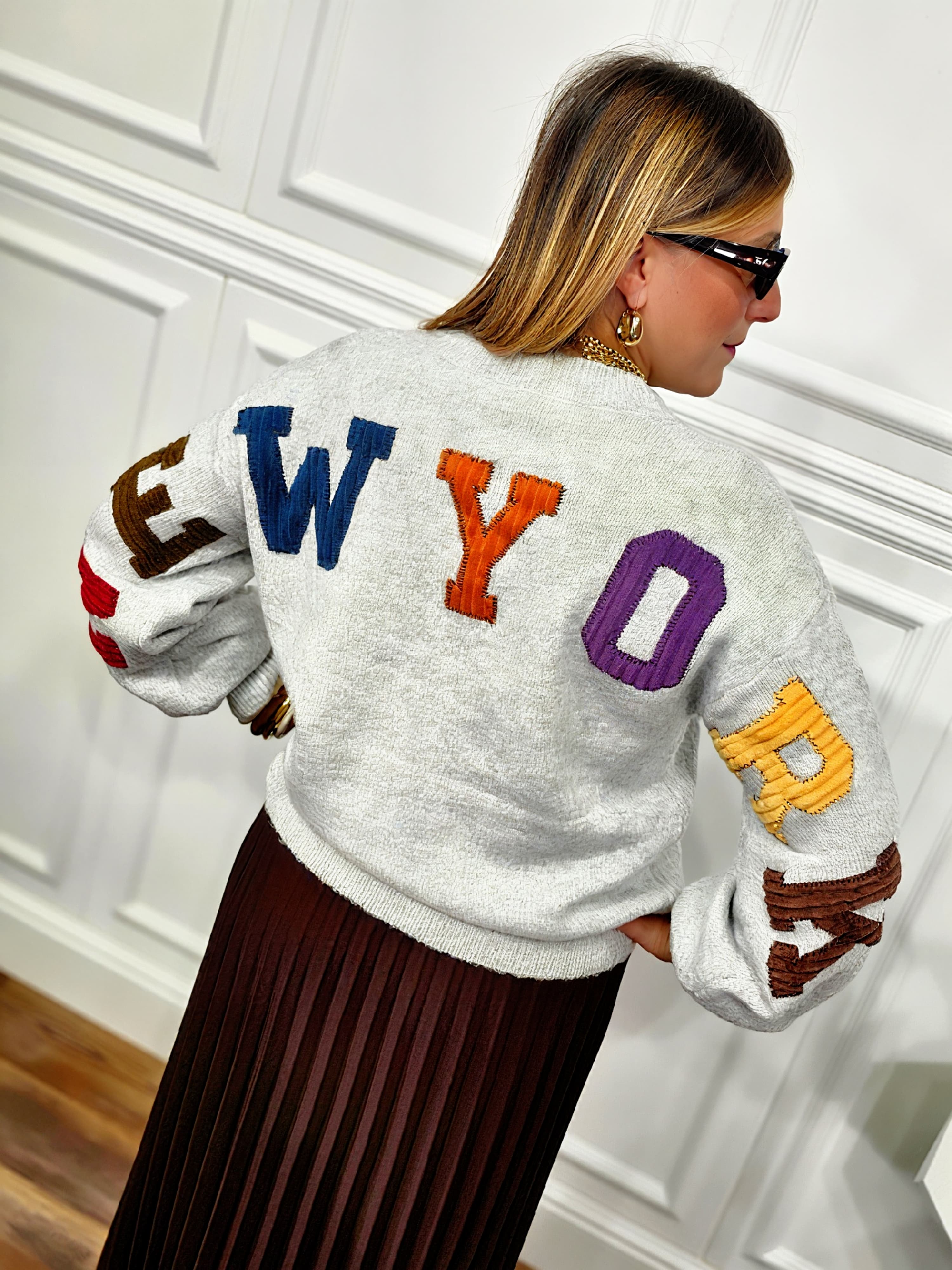 Maglia in lana calda e soffice con lettering NEW YORK ricamato a contrasto sul retro e lungo le maniche. Un capo dal mood urbano e grintoso, perfetto per aggiungere un tocco street ai tuoi look.