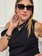 Bracciale con pietre effetto ambra e charm dorati pendenti: cuore sacro, fiore smaltato, quadrifoglio e dettagli iconici dal gusto retrò.