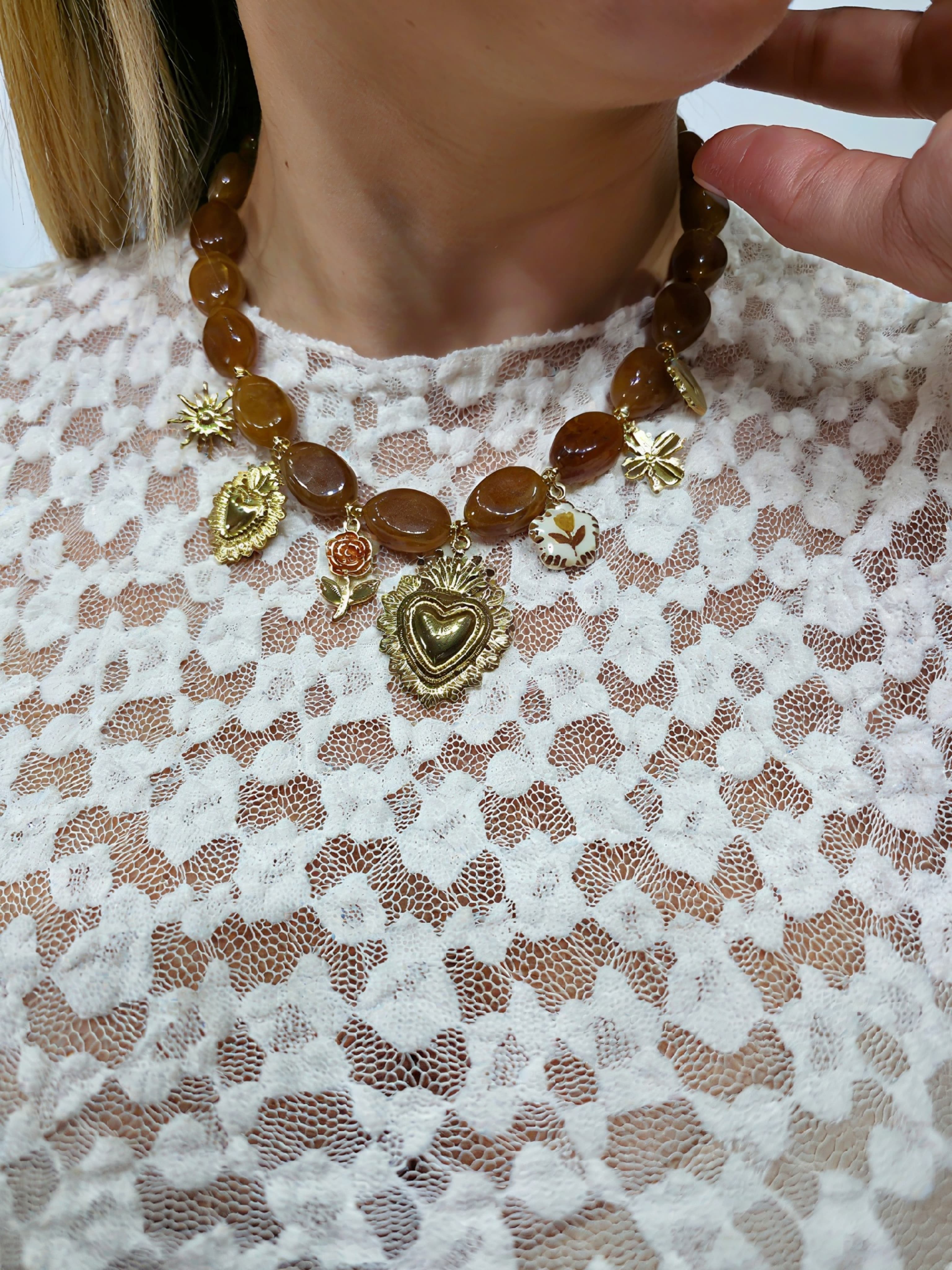 Collana con pietre ovali effetto ambra e ciondoli pendenti dorati: cuori sacri, fiori, stelle e simboli portafortuna per un tocco bohémien e ricercato.