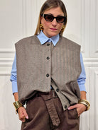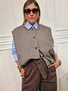 Gilet in maglia morbida color  beige tweed, con scollo paricollo e linea dritta oversize. Chiusura con bottoni frontali e spalle leggermente scese per un fit rilassato ma elegante.